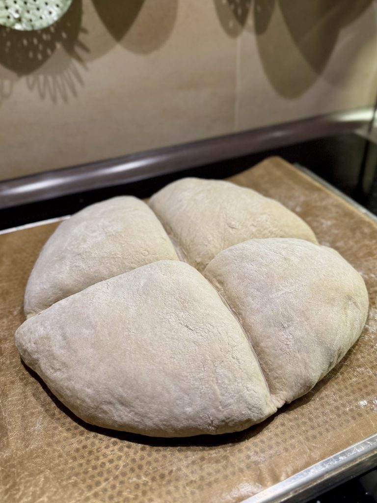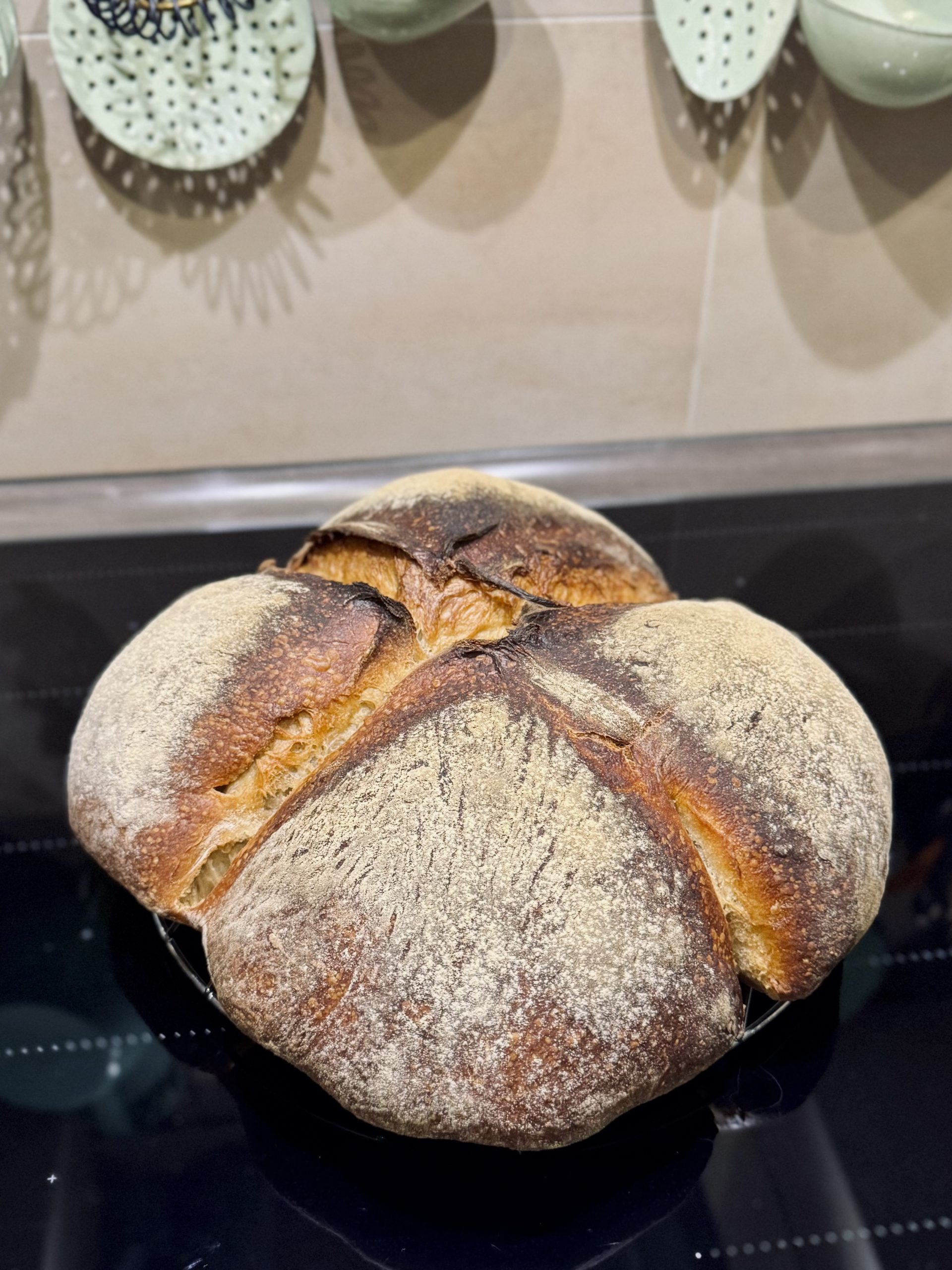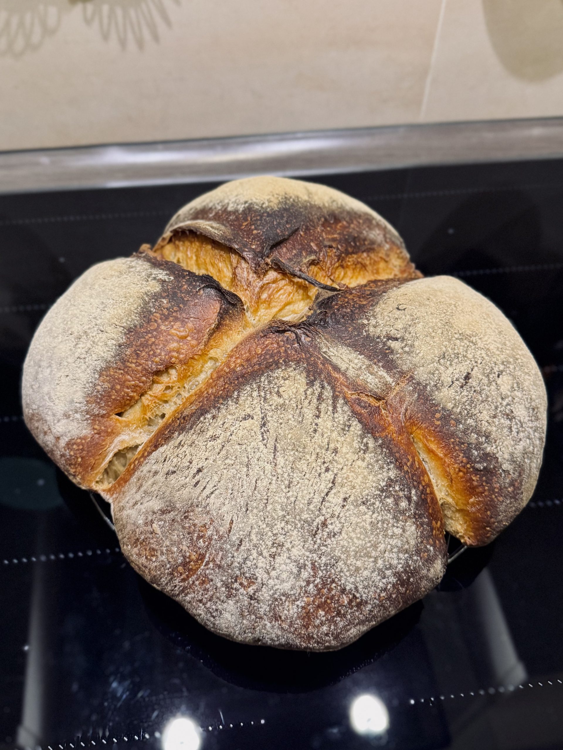 - Tag 4 früh – dehnen und falten – 4h Zimmertemperatur – Brot formen – 2h – Kreuz einpressen – 1h – 65-70 Min backen