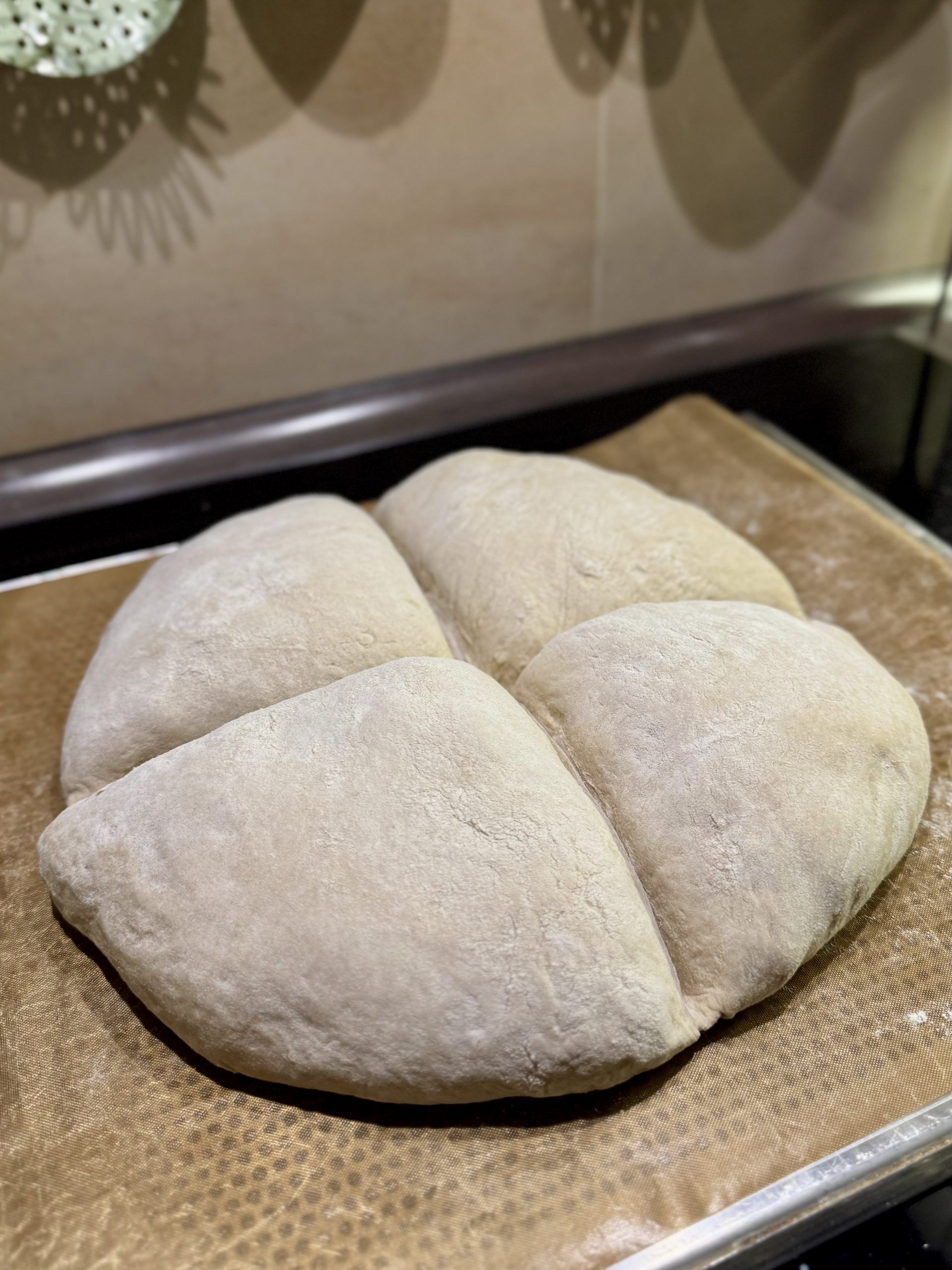 Nach 2 Stunden die Teigoberfläche erneut gut mit Mehl bestäuben und auf eine bemehlte Arbeitsfläche geben. Anschliessend mit einem dünnen Rollstab (alternativ einer abgerundeten Kante z.B. eines Schneidbretts) den Teig – zuerst von links nach rechts und dann von oben nach unten – tief zu einem Kreuz eindrücken. Danach den Teig vorsichtig auf ein mit Backpapier belegtes Blech legen und die Abstände des Kreuzes leicht zusammenschieben. Nochmals mit einem Teigtuch zudecken und für eine weitere Stunde bei Raumtemperatur ruhen lassen.