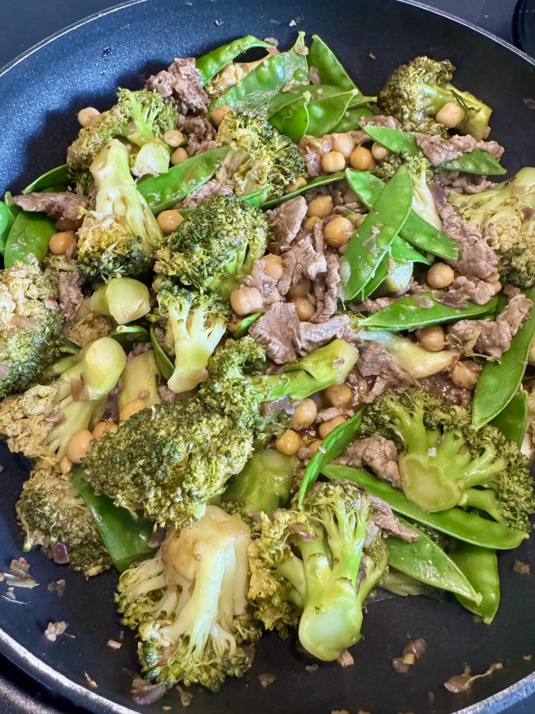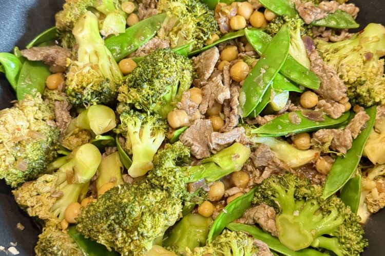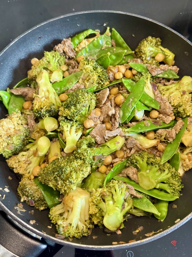Eine Wokpfanne aufheizen und das Fleisch mit einem Esslöffel Öl (idealerweise Erdnussöl) scharf anbraten. Nicht zu lange in der Pfanne lassen, sonst können die dünnen Streifen schnell trocken werden. Fertiges Fleisch aus der Pfanne nehmen und beiseite stellen.