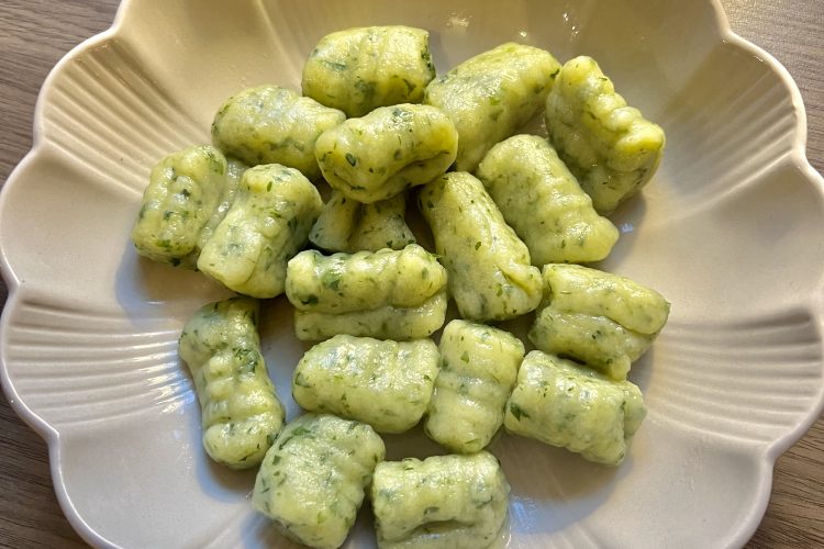 Aus allen Zutaten einen feuchten, fluffigen Teig herstellen. Ich halte etwas Mehl und Gries zurück und vermische alles für etwa 5 Minuten auf Stufe 1-2 in der KitchenAid. Danach gebe ich den Teig auf eine leicht gemehlte Arbeitsfläche und knete ihn richtig durch. Je nach Feuchtigkeit der Kartoffeln, gebe ich noch das restliche Mehl und den Gries dazu. Den Teig länglich formen und auf Mehl etwas ruhen lassen.