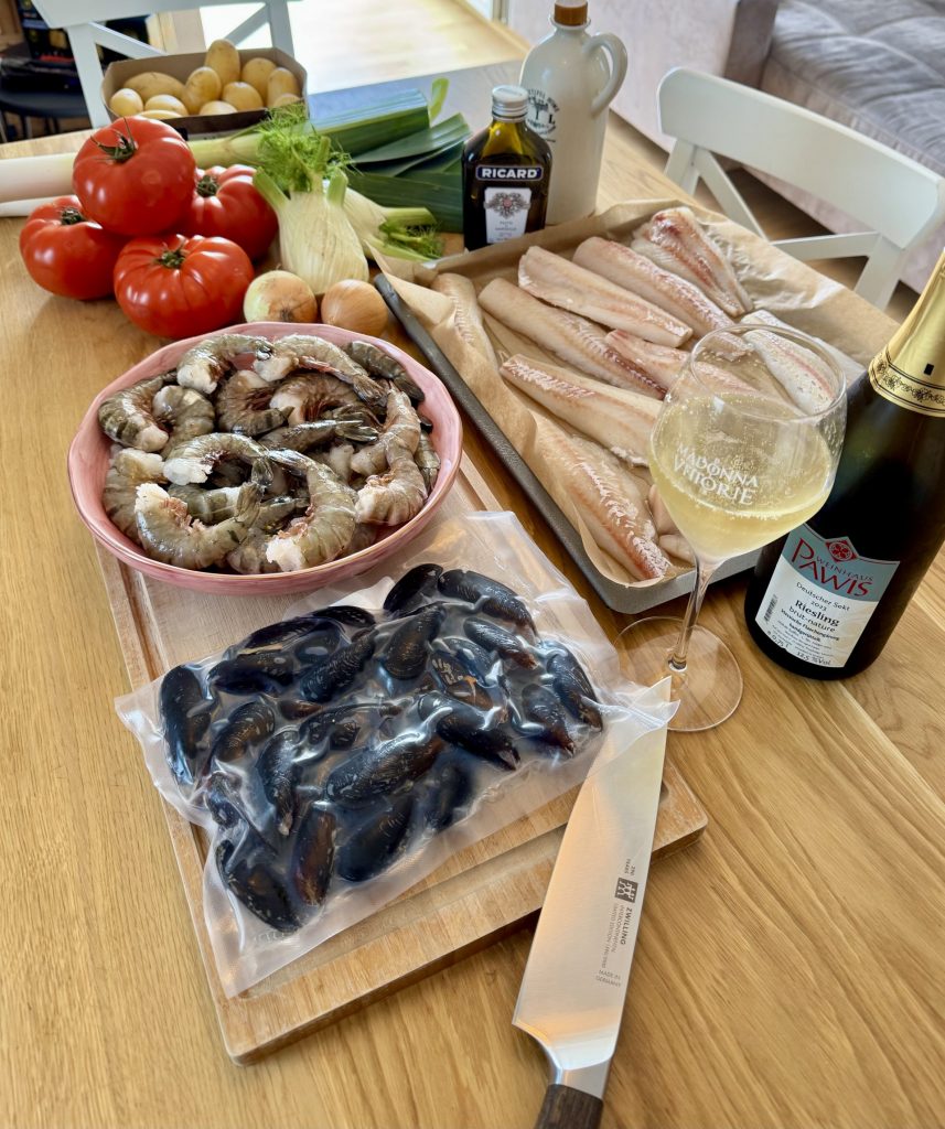 Das Fischfilet in grobe Stücke schneiden. Wenn die Stücke zu klein sind, zerfallen sie später schnell in der Suppe. Garnelen je nach Wunsch schälen – ich entferne die Schale, da sich die Suppe dann besser essen lässt. Muscheln unter kaltem Wasser gut abspülen. Geöffnete oder zerbrochene Muscheln müssen entfernt werden. Fisch, Garnelen und Muscheln zur Suppe in den Topf geben.