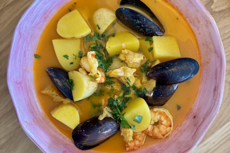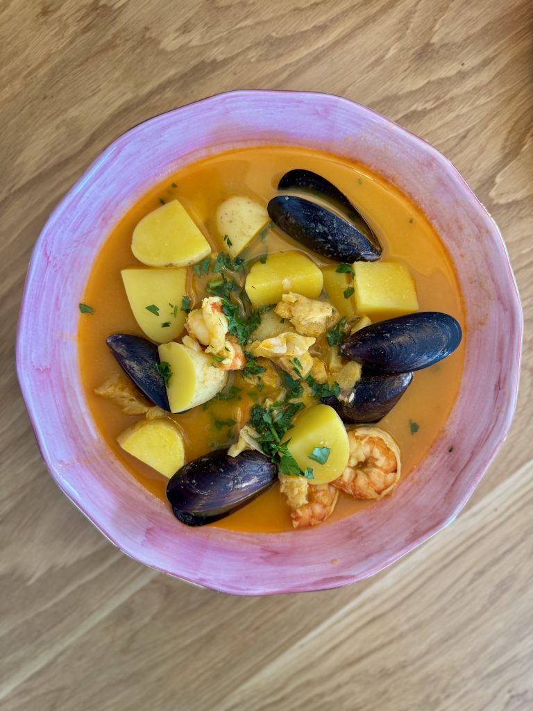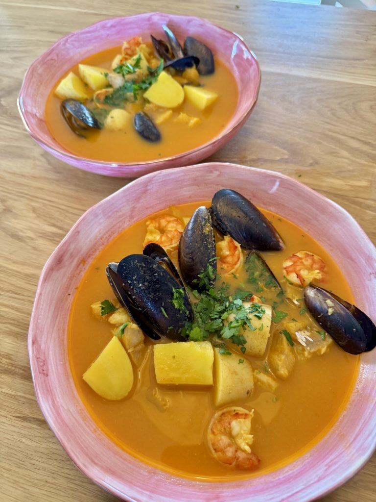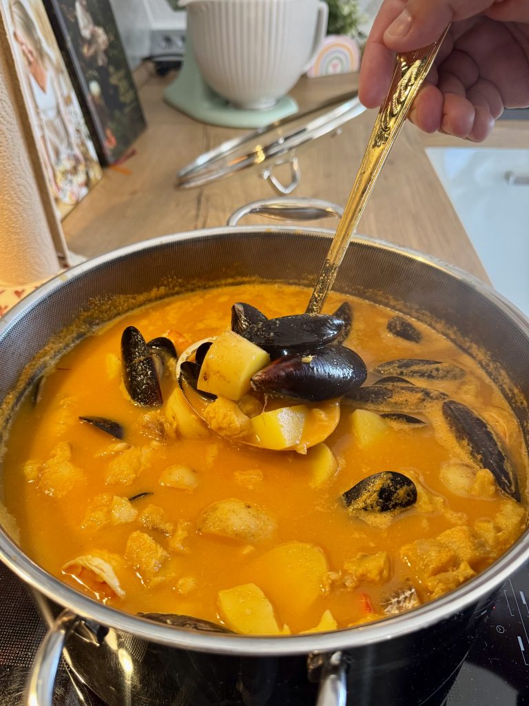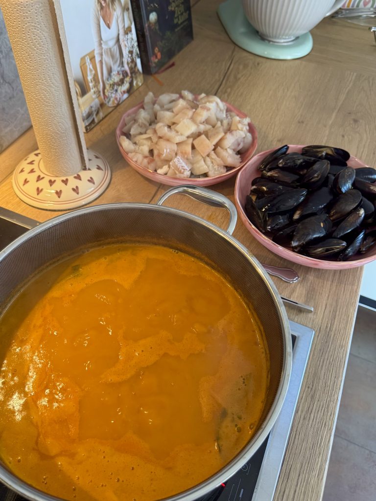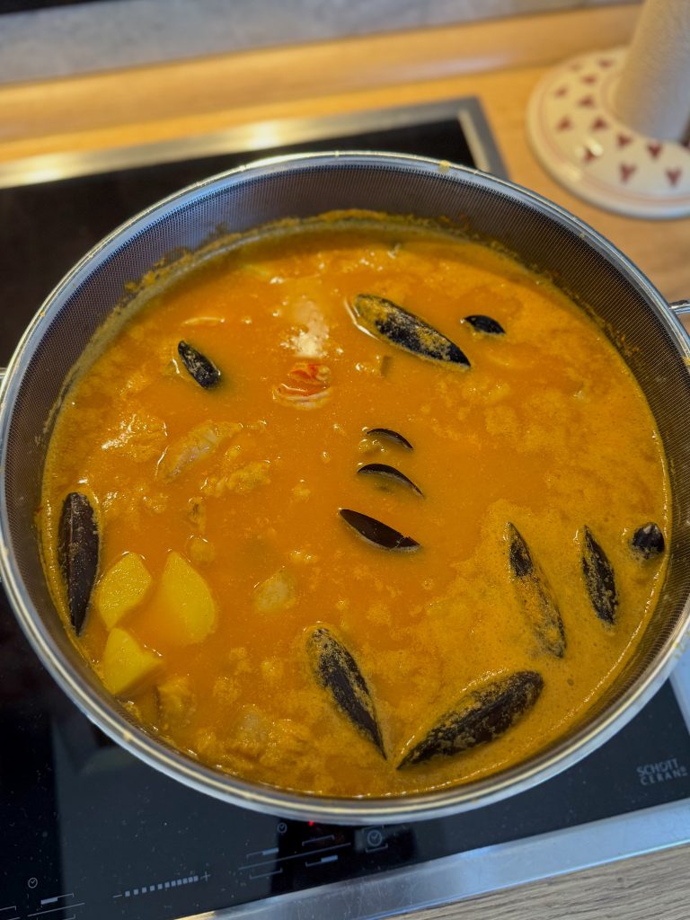 Die Suppe abgedeckt für etwa 7 Minuten bei geringer Hitze köcheln lassen. Wichtig ist, dass der Fisch gar ist, die Garnelen rosa sind und die Muscheln sich geöffnet haben. Muscheln, die sich während des Kochens nicht geöffnet haben, müssen ebenfalls entsorgt werden.