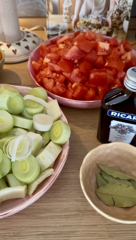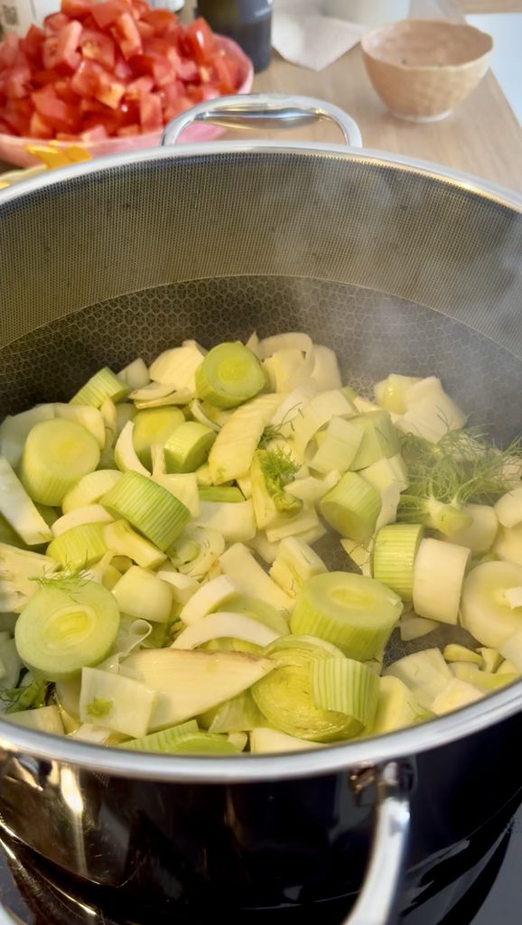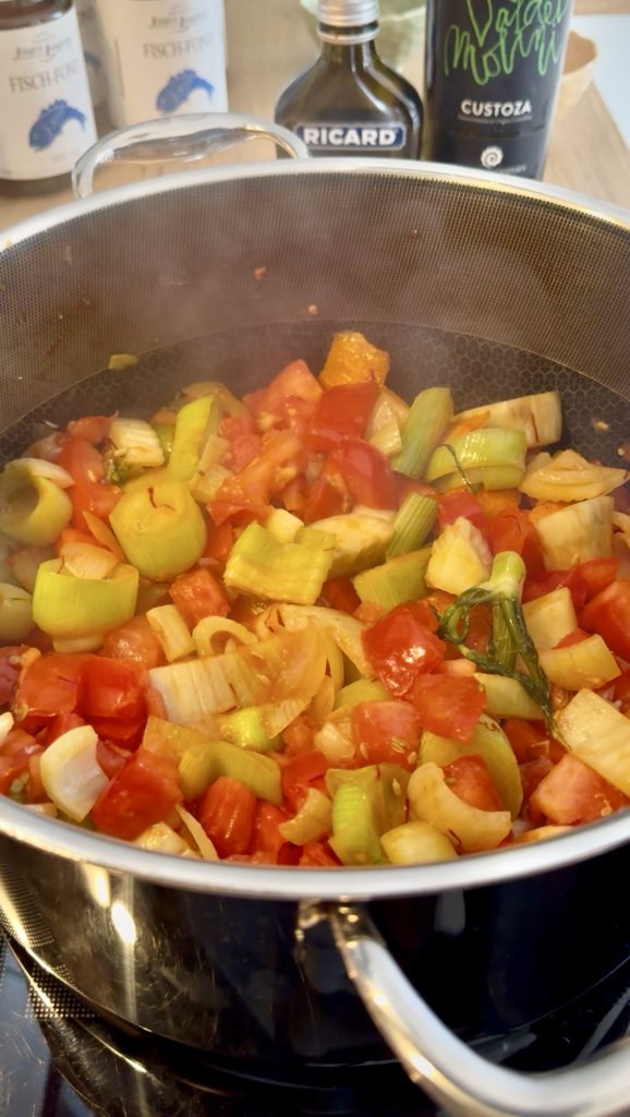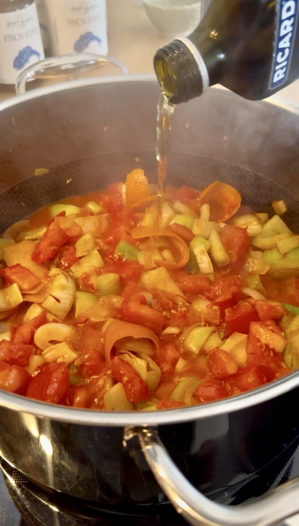 In einem großen Topf etwas Olivenöl erhitzen, Zwiebel, Fenchel und Lauch zugeben und andünsten, bis das Gemüse glasig ist. Fenchelsamen, Safranfäden, Tomaten, Tomatenmark und Orangenschale dazugeben und etwas mit anbraten. Mit dem Pastis und dem Weißwein ablöschen, die Orangenschale entfernen und den Fischfond zugeben.