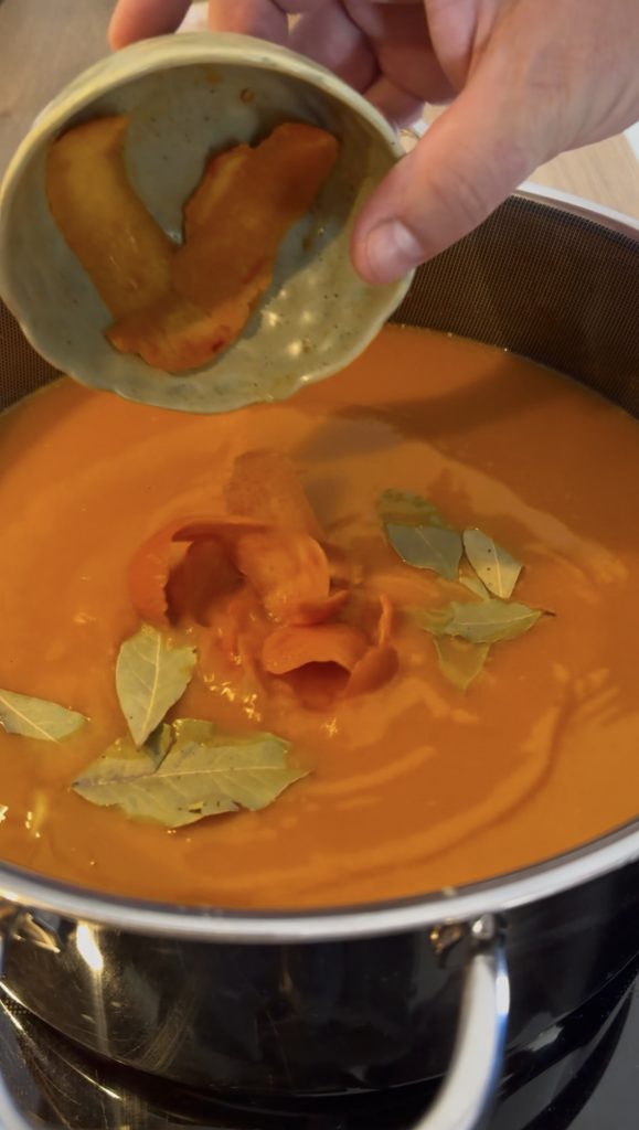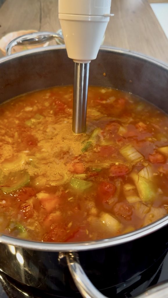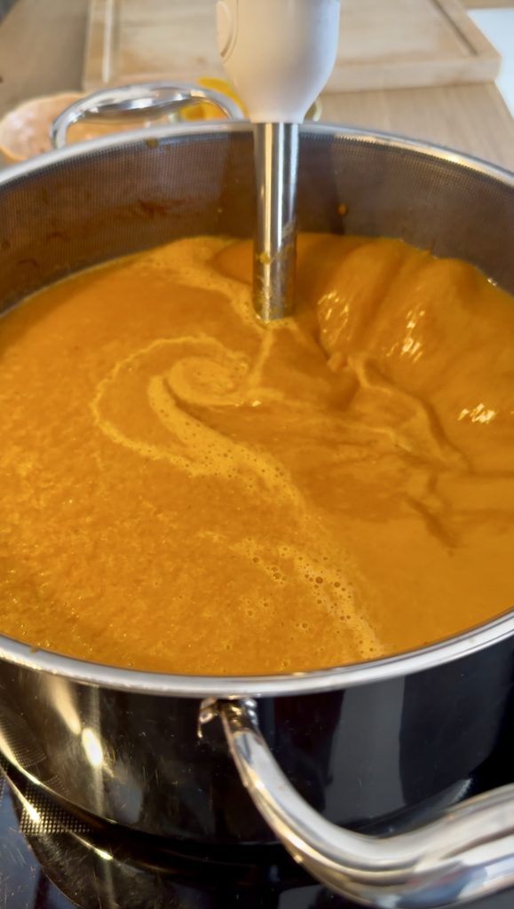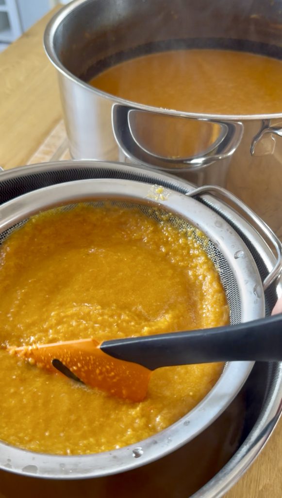 Die Suppe pürieren und durch ein Sieb streichen, um Stücke zu entfernen.
