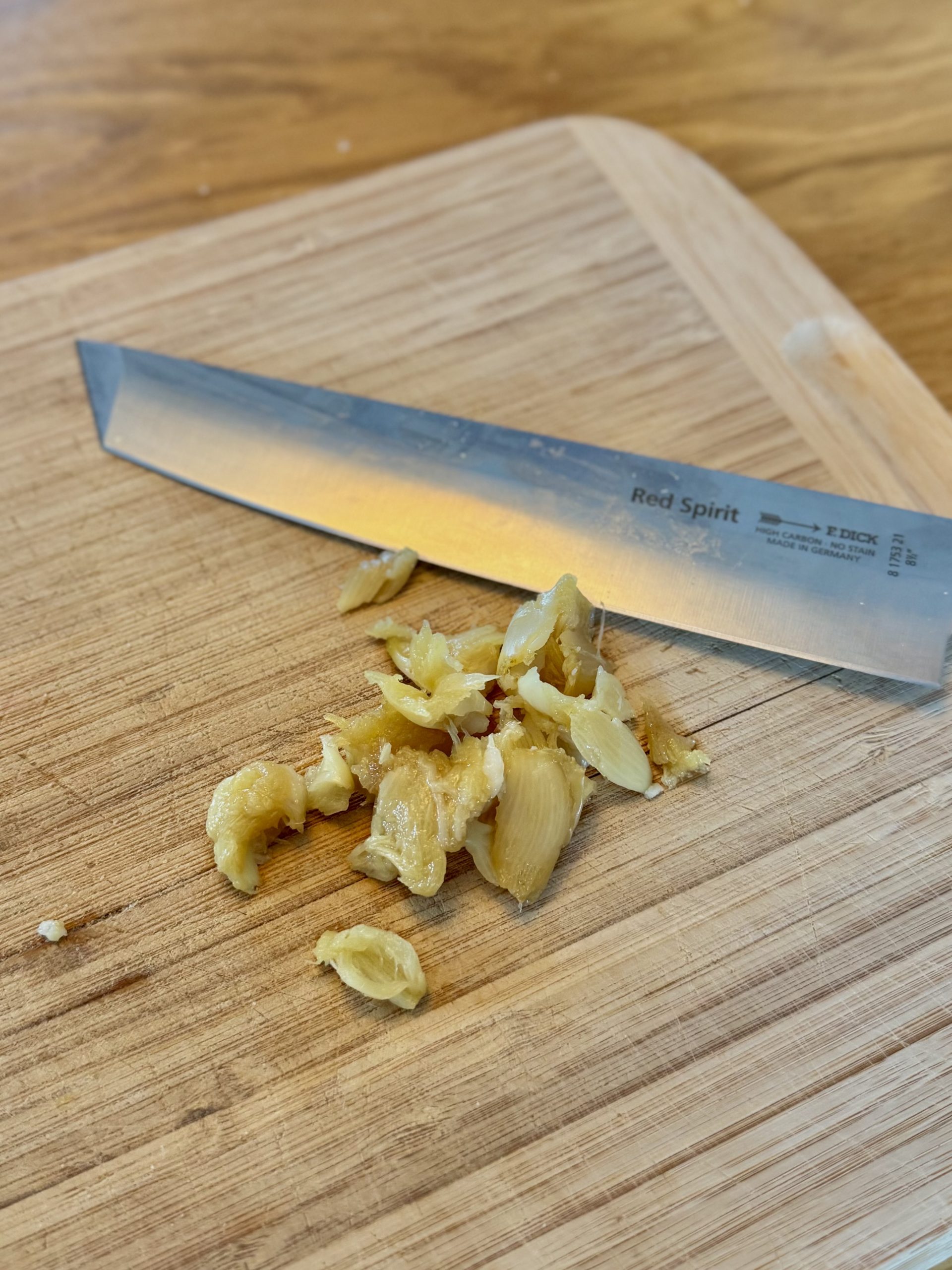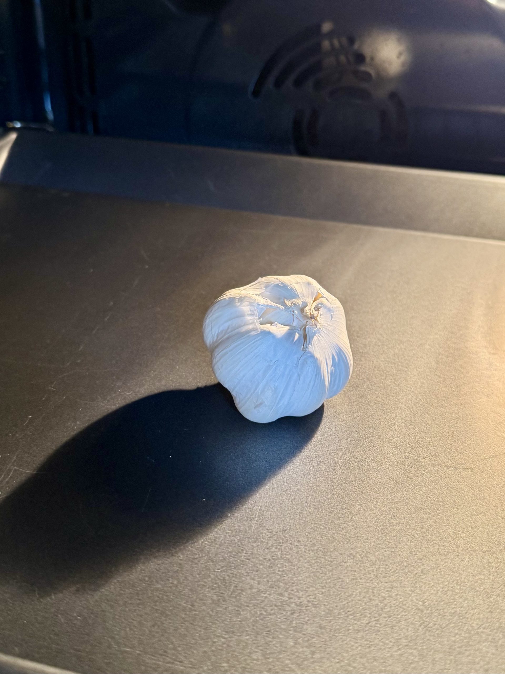 Backofen auf 200°C Ober-/Unterhitze vorheizen. Knoblauchknolle auf ein Backblech stellen und für 30 Minuten backen. Aus dem Ofen nehmen und abkühlen lassen. Danach Knoblauch aus der Haut drücken und fein hacken.