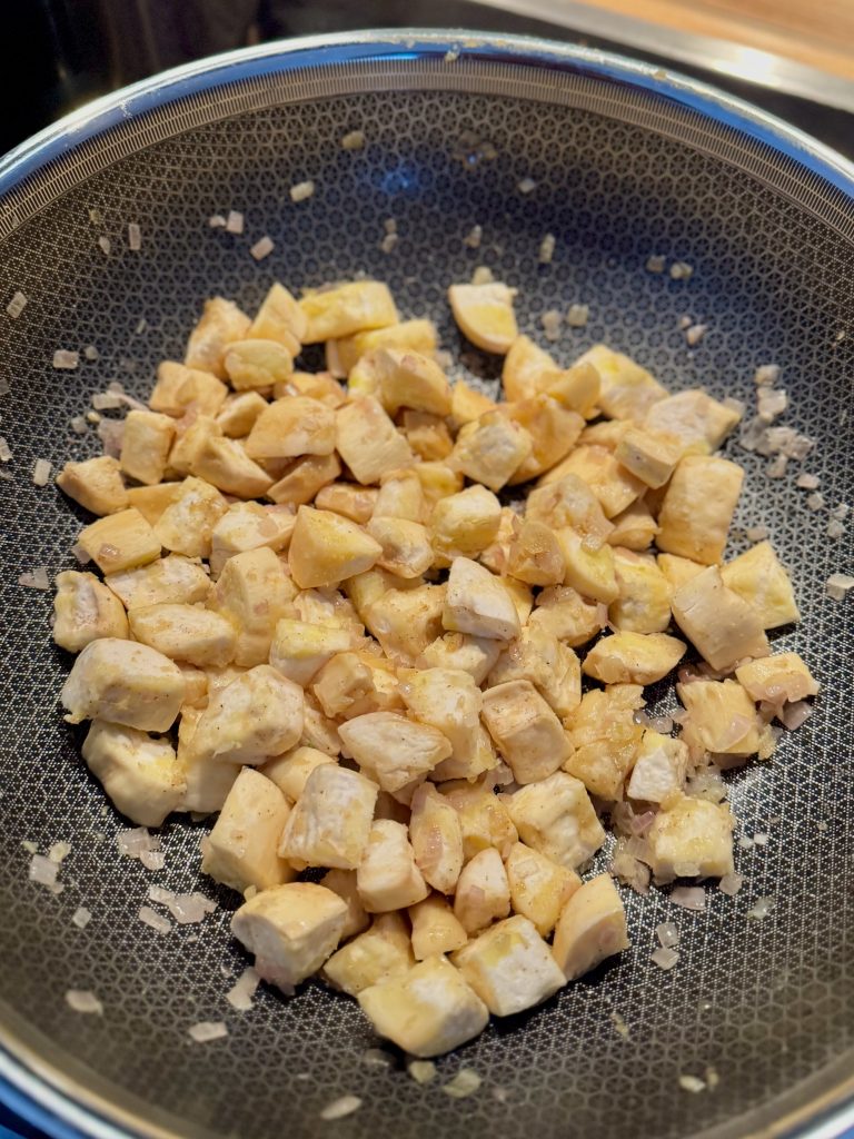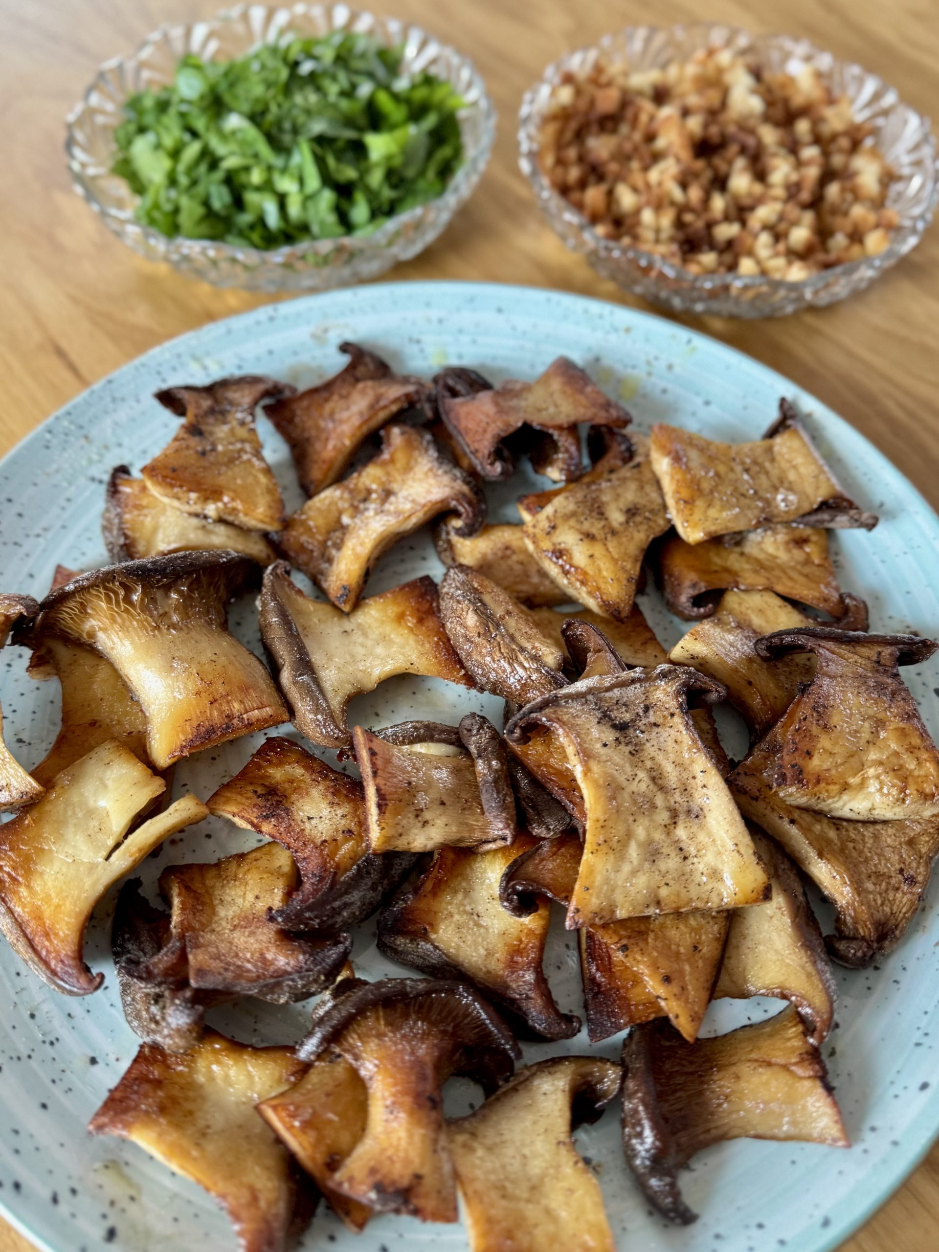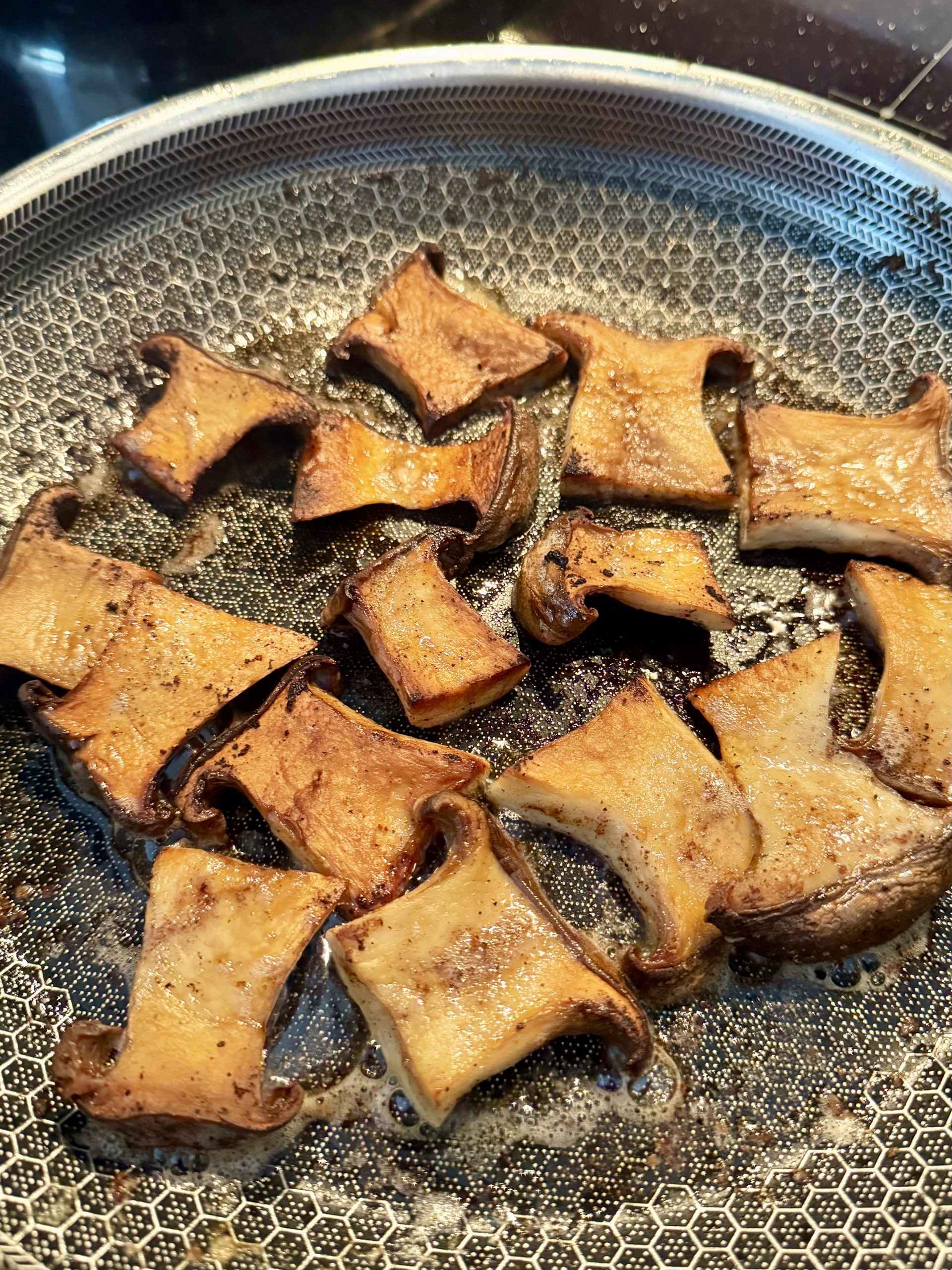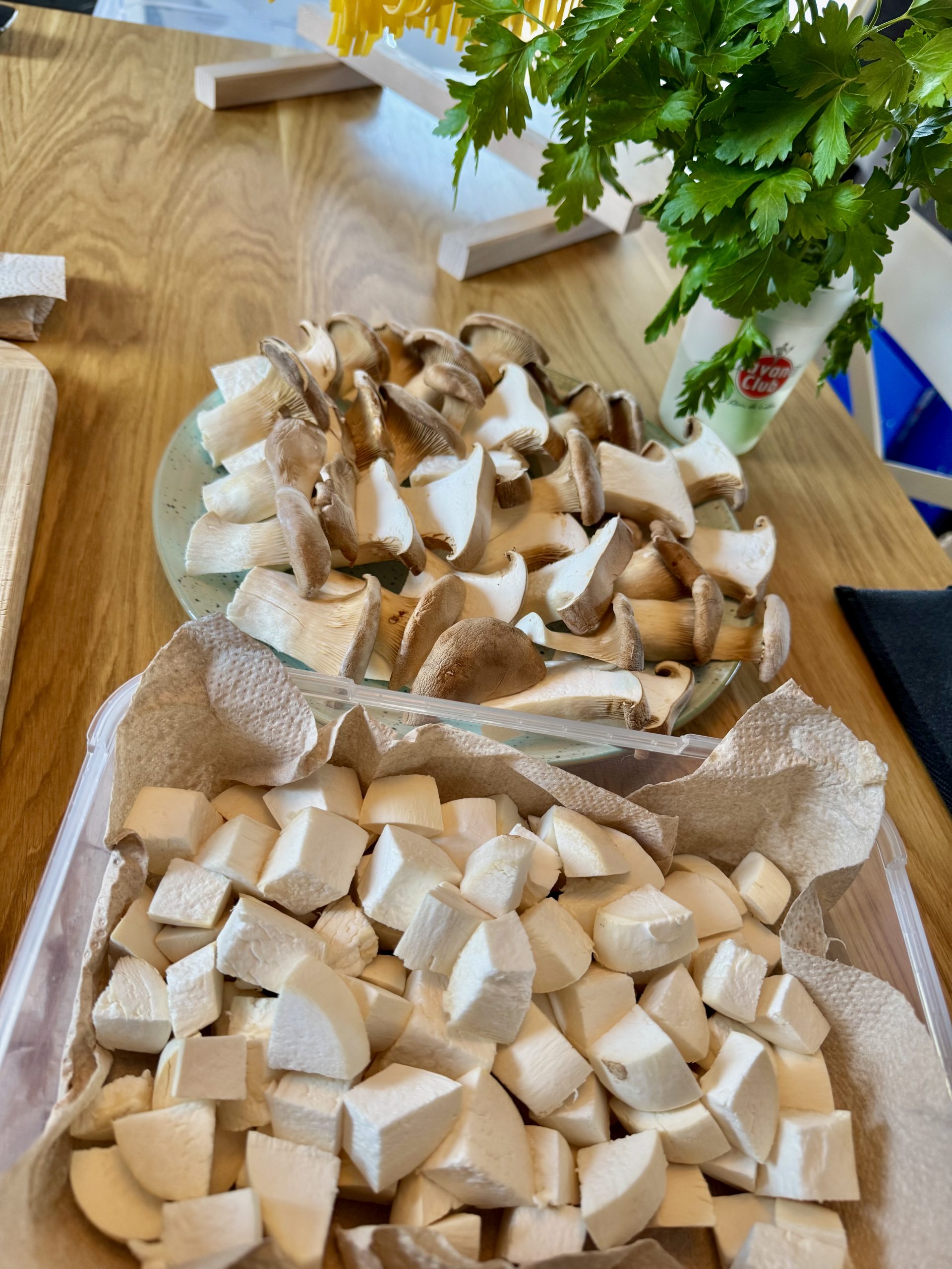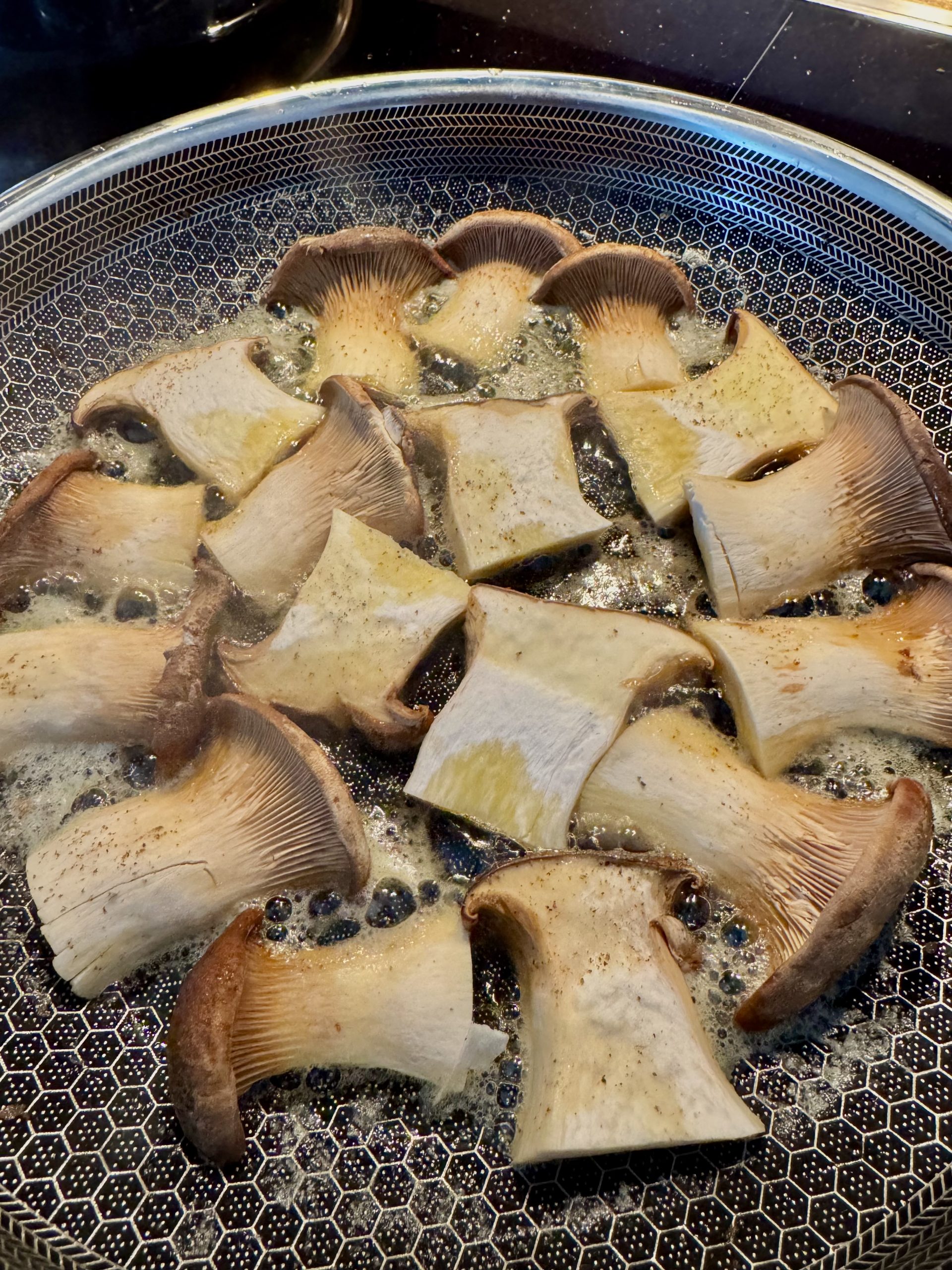 Von den großen Kräuterseitlingen etwa 2/3 des Fußes wegschneiden und grob würfeln. Die Köpfe je nach Größe in 2cm dicke Streifen schneiden.