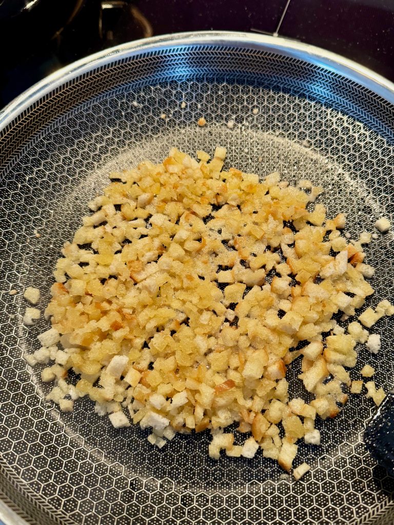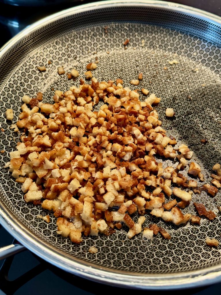 Weißbrot in sehr kleine Würfel schneiden. Diese in Butter anbraten und beiseite stellen.