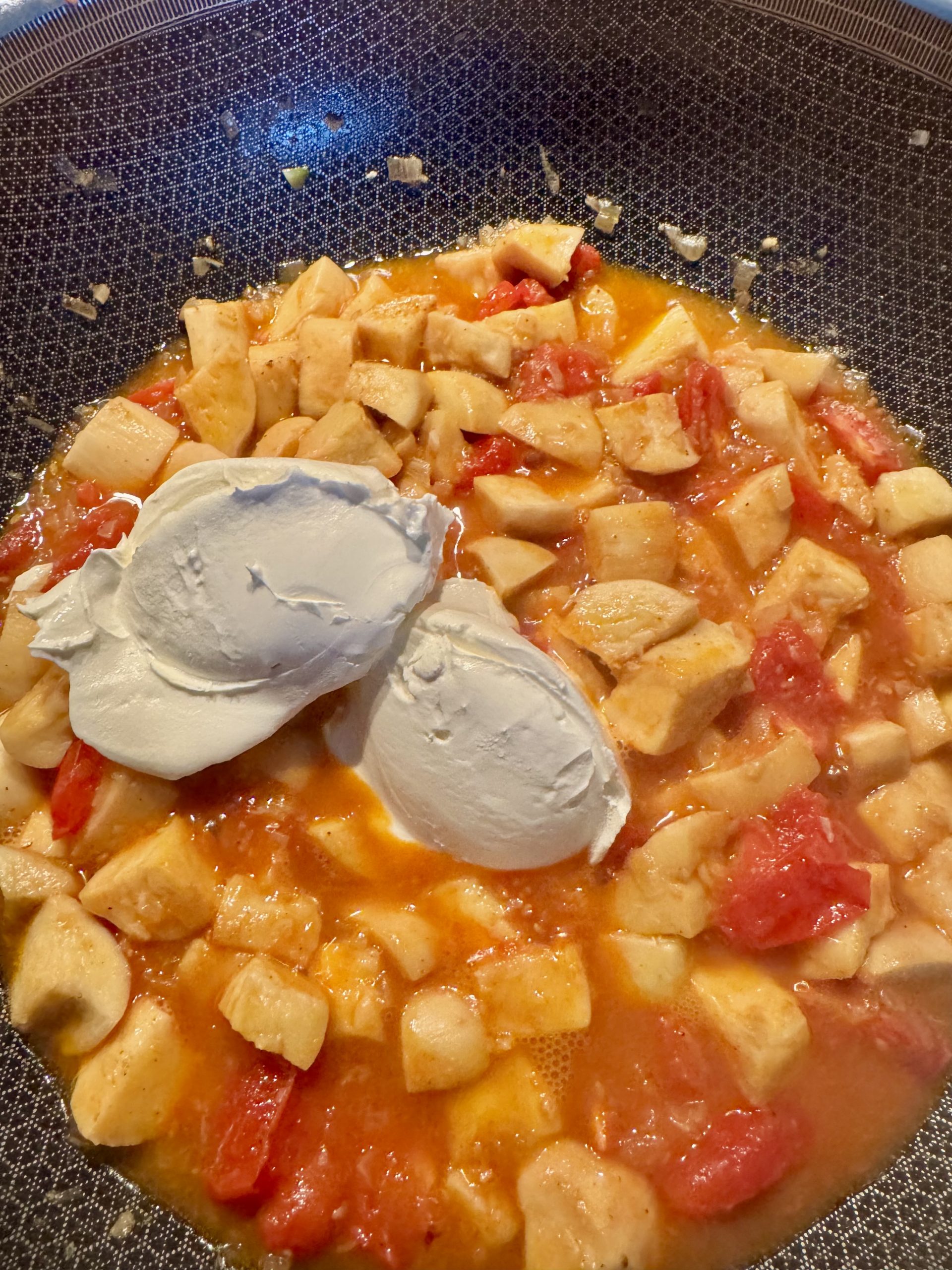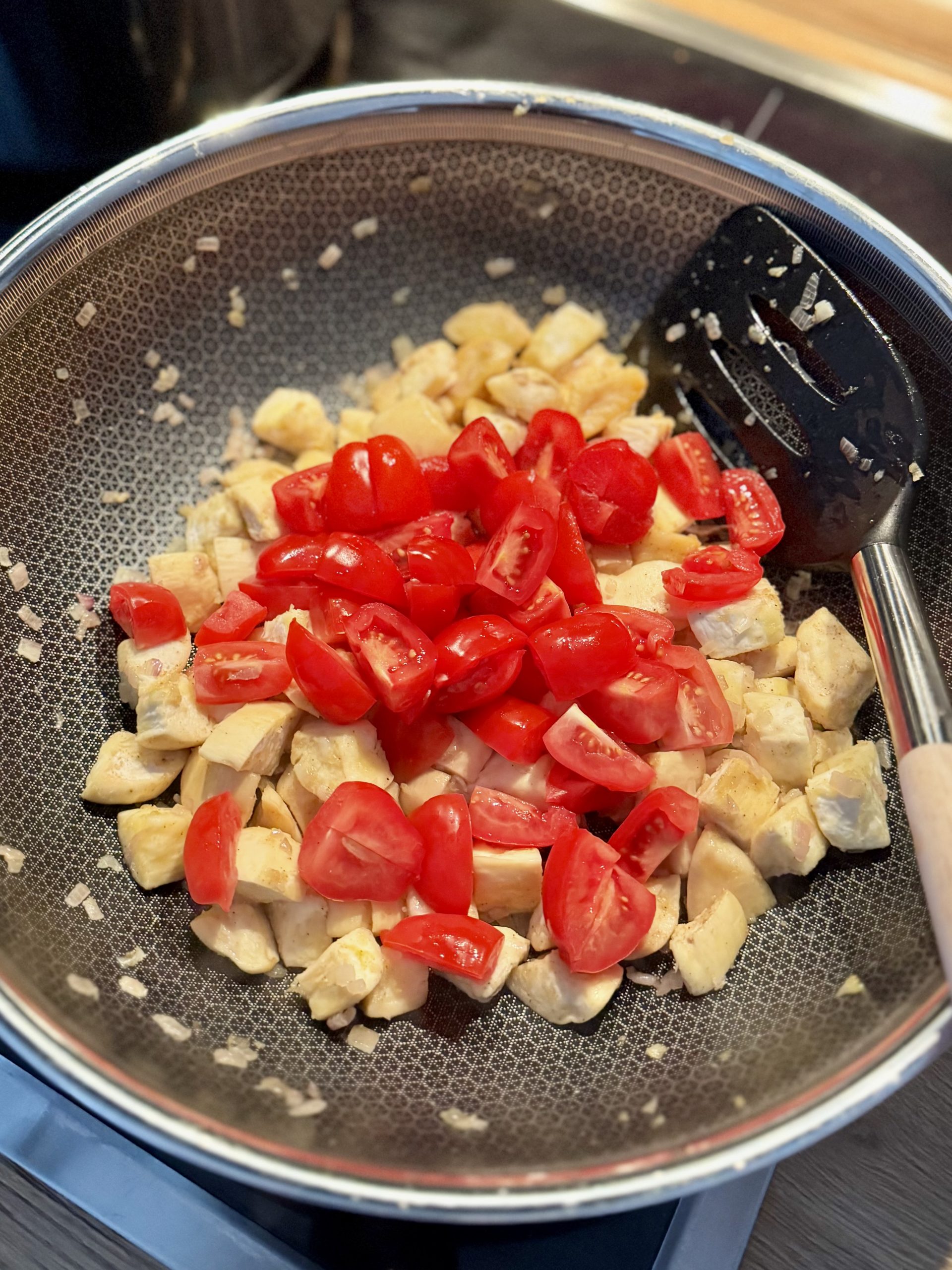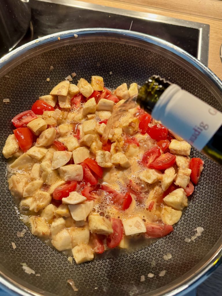 Parallel in einer großen Pfanne Butter erhitzen und Schalotten glasig dünsten. Den Knoblauch und etwas Olivenöl zugeben. Schließlich die Tomaten dazugeben. Alles mit Weißwein ablöschen und für ein paar Minuten kochen.