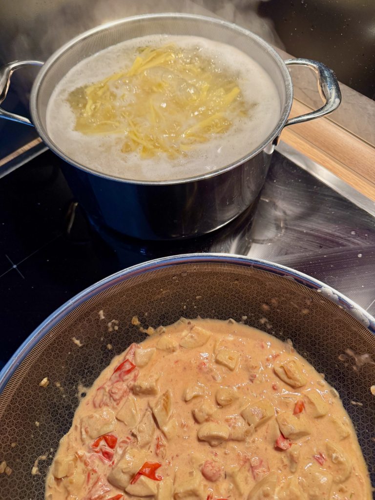 Bandnudeln nach Nudeln Grundrezept zubereiten und etwas zu al dente kochen (etwa 10 Minuten). Sie garen später noch in der Sauce weiter.