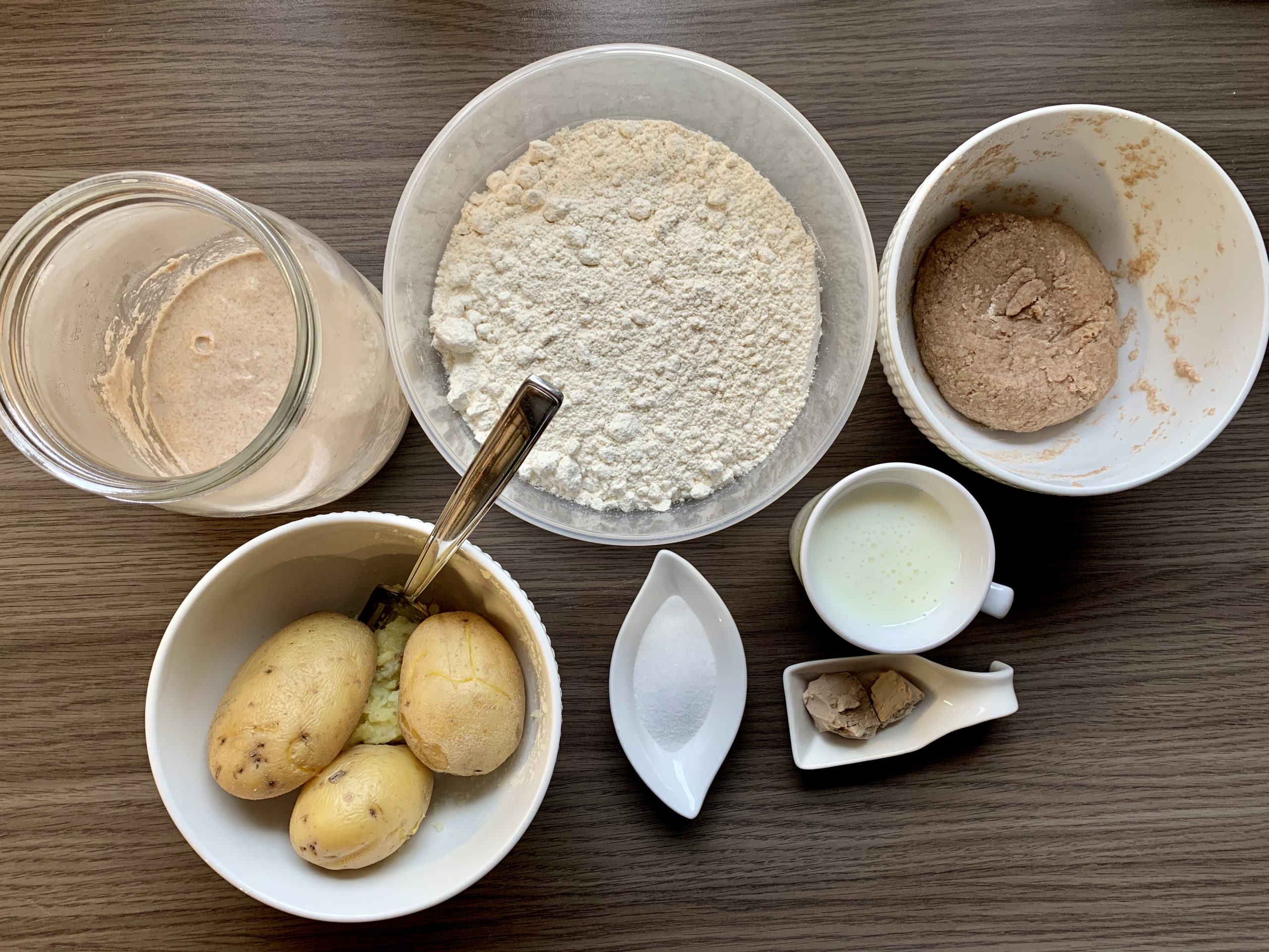 - Tag 2: Kartoffeln kochen + Hauptteig -> 90-120 Min gehen -> Formen -> 15 Minuten gären -> 45 Min backen = etwa 3,5h