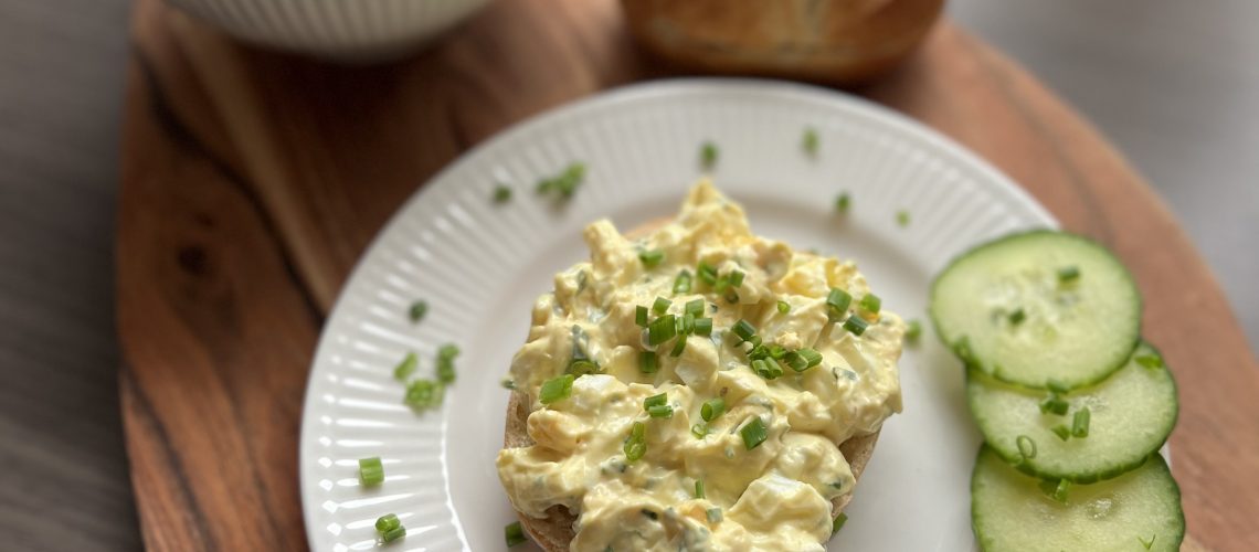 5 gekochte Bio-Eier 125g Mayonnaise mit Öl Honigsenf Schnittlauch Chilisalz Gekochte Eier würfeln und alles vorsichtig zusammenrühren. Mit Senf, Chilisalz und Schnittlauch abschmecken und zum durchziehen kalt stellen.
