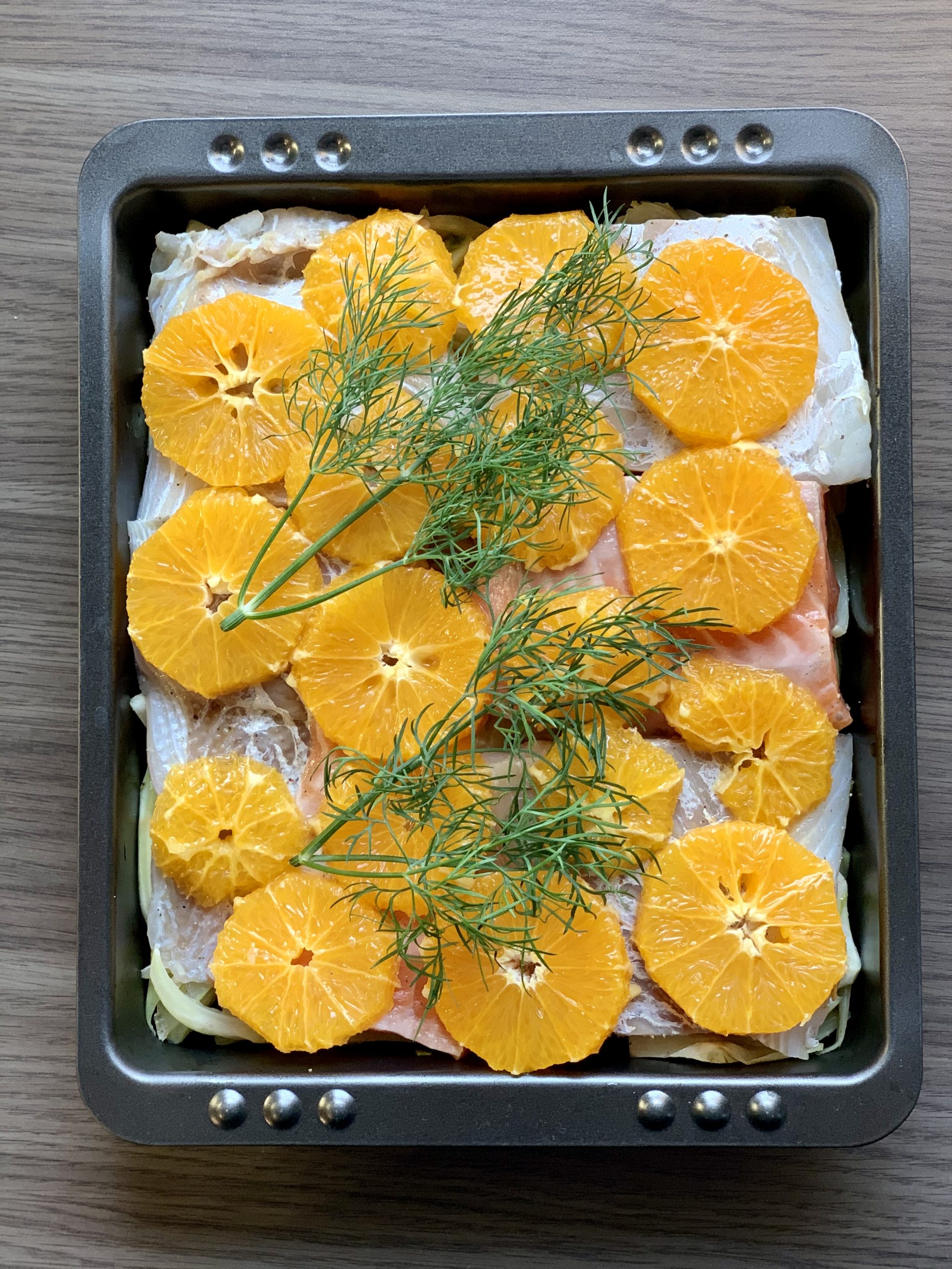 Den Fenchel in eine abdeckbare Aufflaufform geben. Die Fischfilets von beiden Seiten pfeffern und salzen und auf den Fenchel legen. Zuletzt die Orangenscheiben darauf verteilen und mit zwei bis drei Stielen Dill garnieren. Alles abdecken und im vorgeheizten Backofen etwa 15 Minuten garen. Wer keine abdeckbare Auflaufform hat, kann auch Alufolie nutzen um ein dichtes Schiffchen zu basteln. Ist halt ungesünder wegen der Folie.