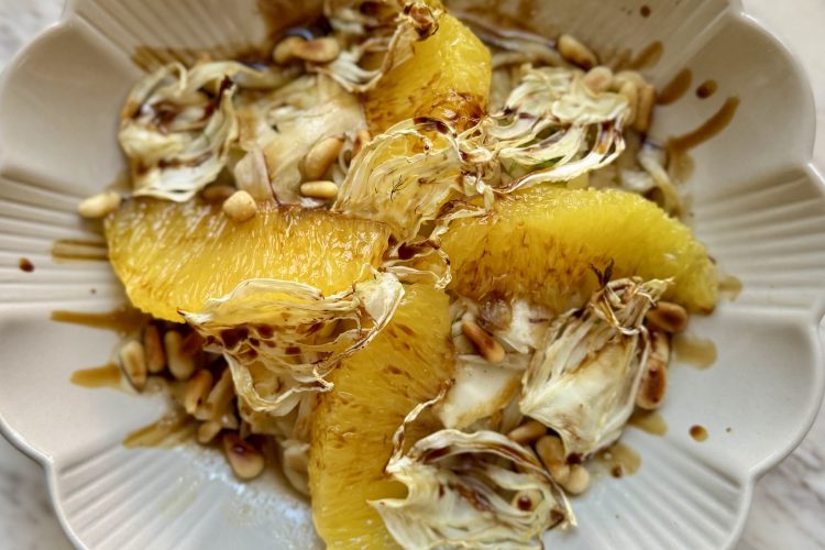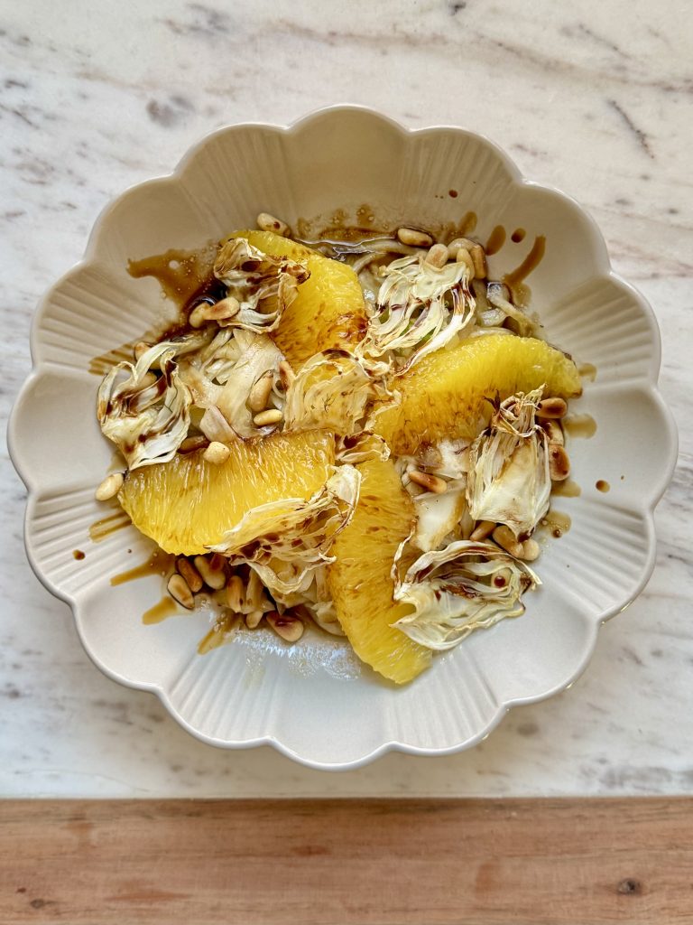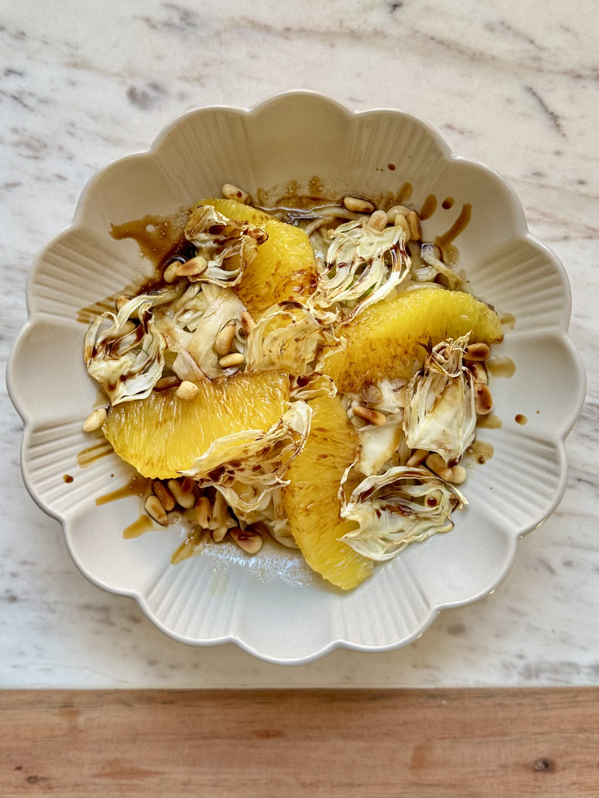 Den marinierten Fenchel auf einen Teller oder in eine Schüssel geben und etwas Dressing dazugeben. Pinienkerne über dem Salat verteilen und mehrere Orangenfilets dazulegen. Am Ende die gegrillten Fenchelscheiben auf dem Salat verteilen und nochmal mit altem Basilikum beträufeln