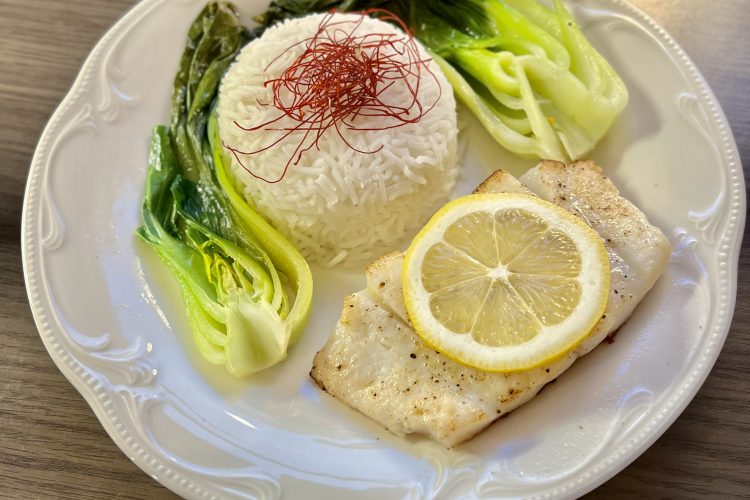 Reis, Pak Choi, Sauce und Fischfilets auf einem Teller anrichten, ggf. mit frischen Pfeffer und Zitrone nachwürzen.