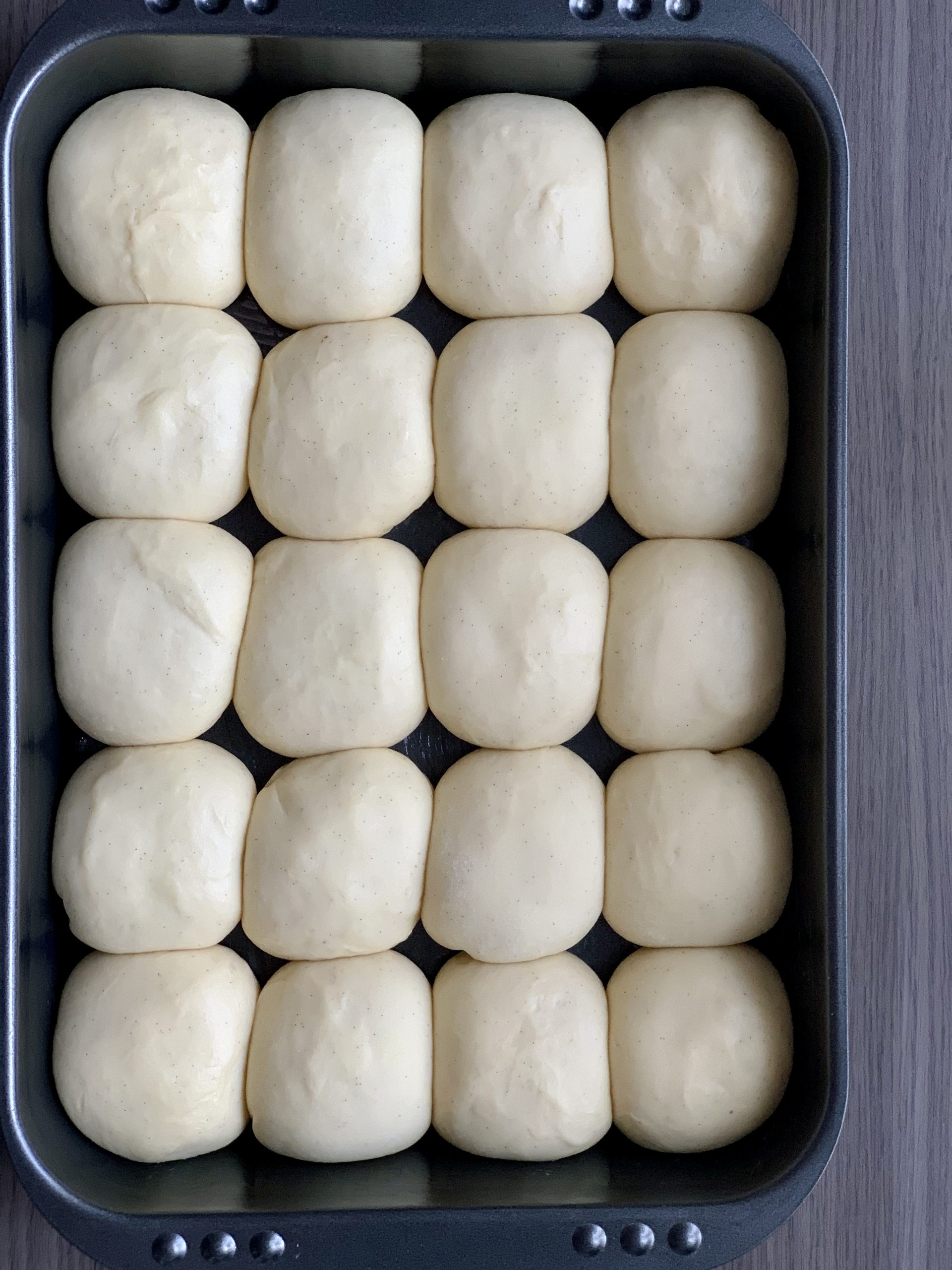 Die Teiglinge in die vorbereitete Auflaufform legen, mit einem Teigtuch zudecken und im auf 30 Grad vorgeheizten Backofen etwa 70 Min. gären lassen. Anschließend die Form aus dem Ofen nehmen, das Teigtuch entfernen und noch weitere 20 Min. gären lassen.