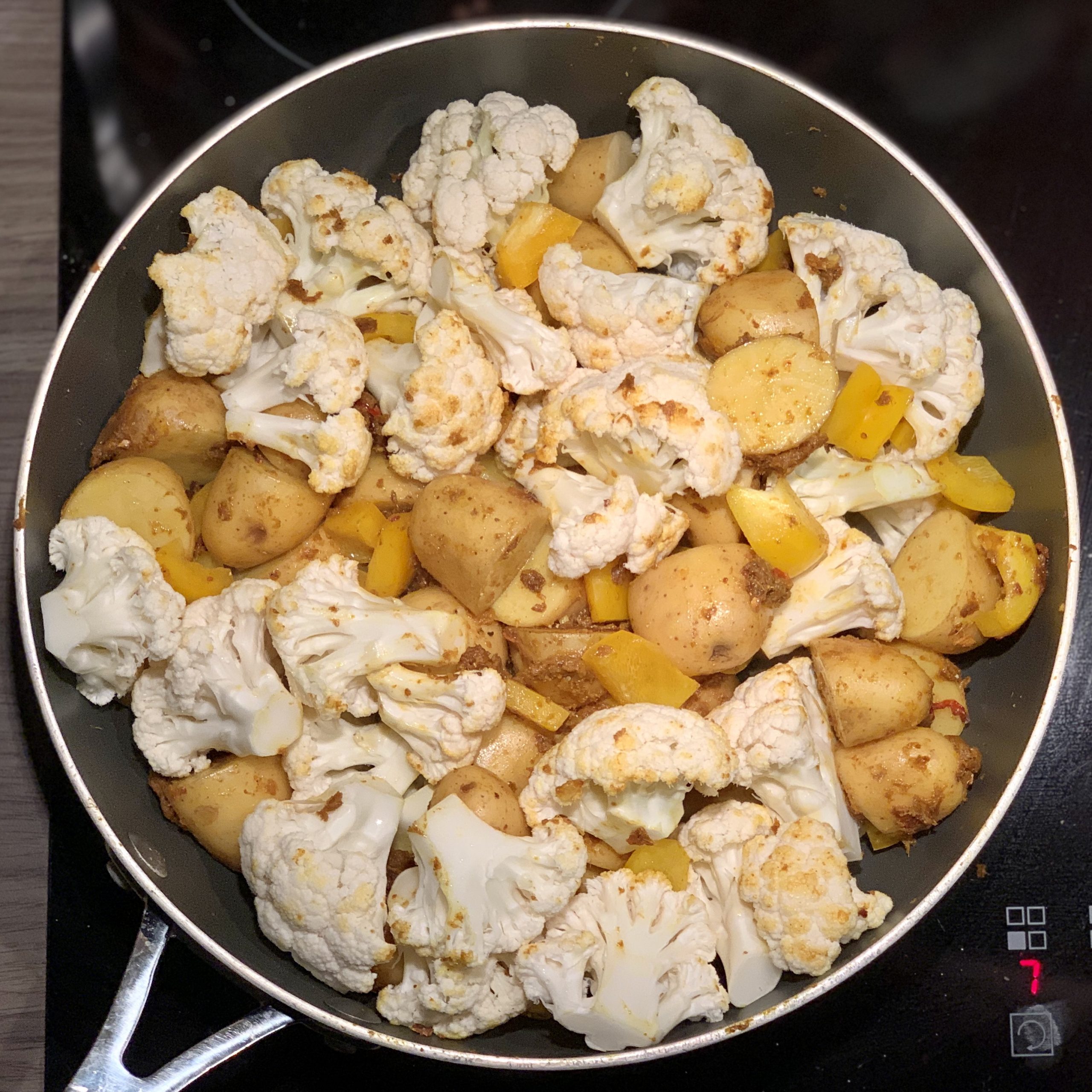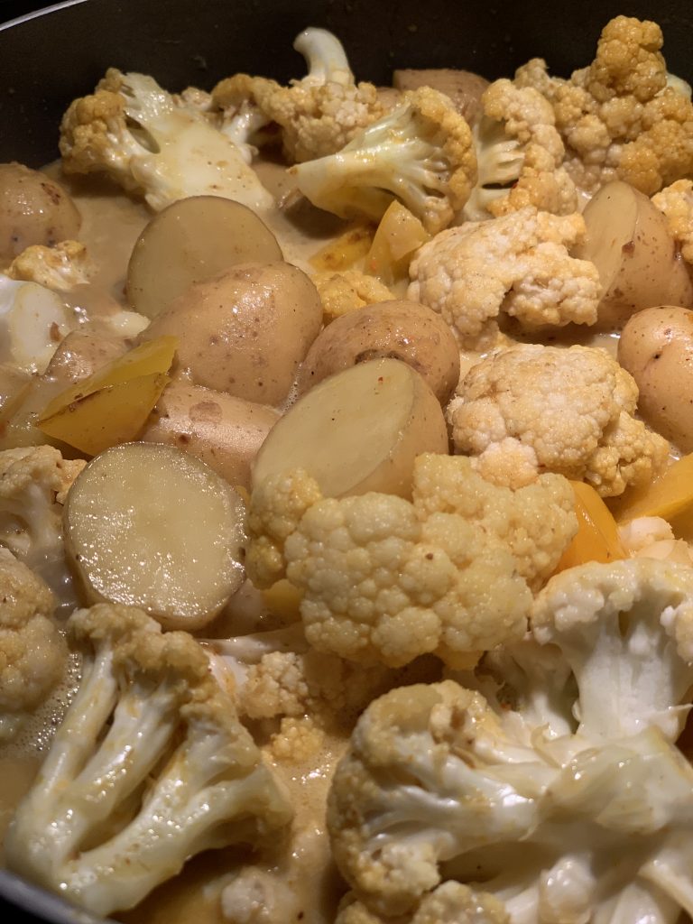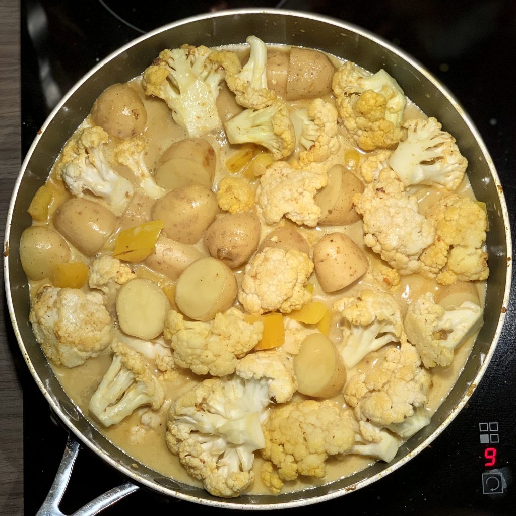 Öl in einer hohen Pfanne oder einem Topf erhitzen. Knoblauch, Ingwer, Chili und (falls vorhanden) frisches Kurkuma darin kurz andünsten. Currypaste, Currypulver, Kurkuma (falls kein frisches verwendet wurde) und Kreuzkümmel zugeben und kurz mitdünsten, bis es zu duften beginnt. Blumenkohl und Kartoffeln zugeben und ebenfalls kurz mitdünsten. Mit Salz und Pfeffer würzen.