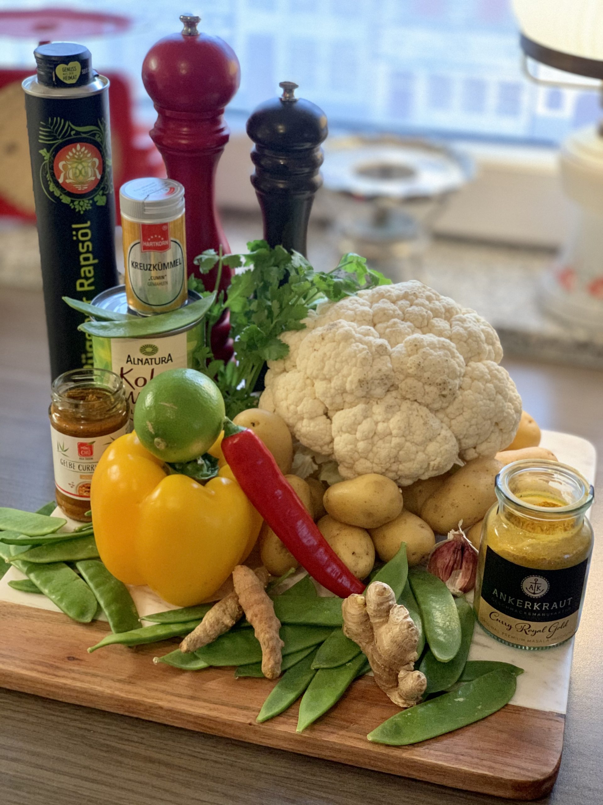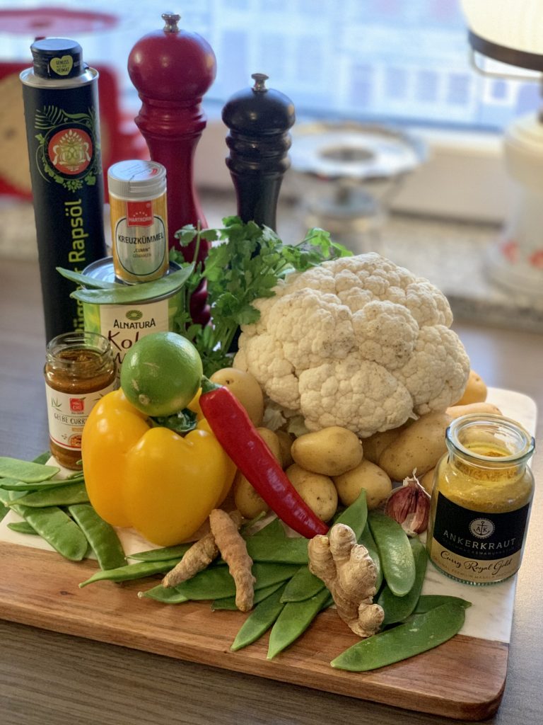 Blumenkohl putzen, waschen und in Röschen teilen. Paprika putzen, waschen und grob würfeln. Kartoffeln gründlich waschen und halbieren (je nach Größe ggf. vierteln, damit sie gut essbar sind). Knoblauch schälen und fein würfeln. Ingwer und (falls vorhanden) frisches Kurkuma schälen und fein reiben. Bio-Ingwer muss nicht zwingend geschält werden, dann reicht heiß abspülen. Bei der Verarbeitung von frischem Ingwer und insbesondere von frischem Kurkuma sollten unbedingt Handschuhe getragen werden. Frisches Kurkuma färbt ALLES – Hände, Reibe, Schneidunterlage, Spülbecken, Handtücher – also lieber vorsichtig damit umgehen!