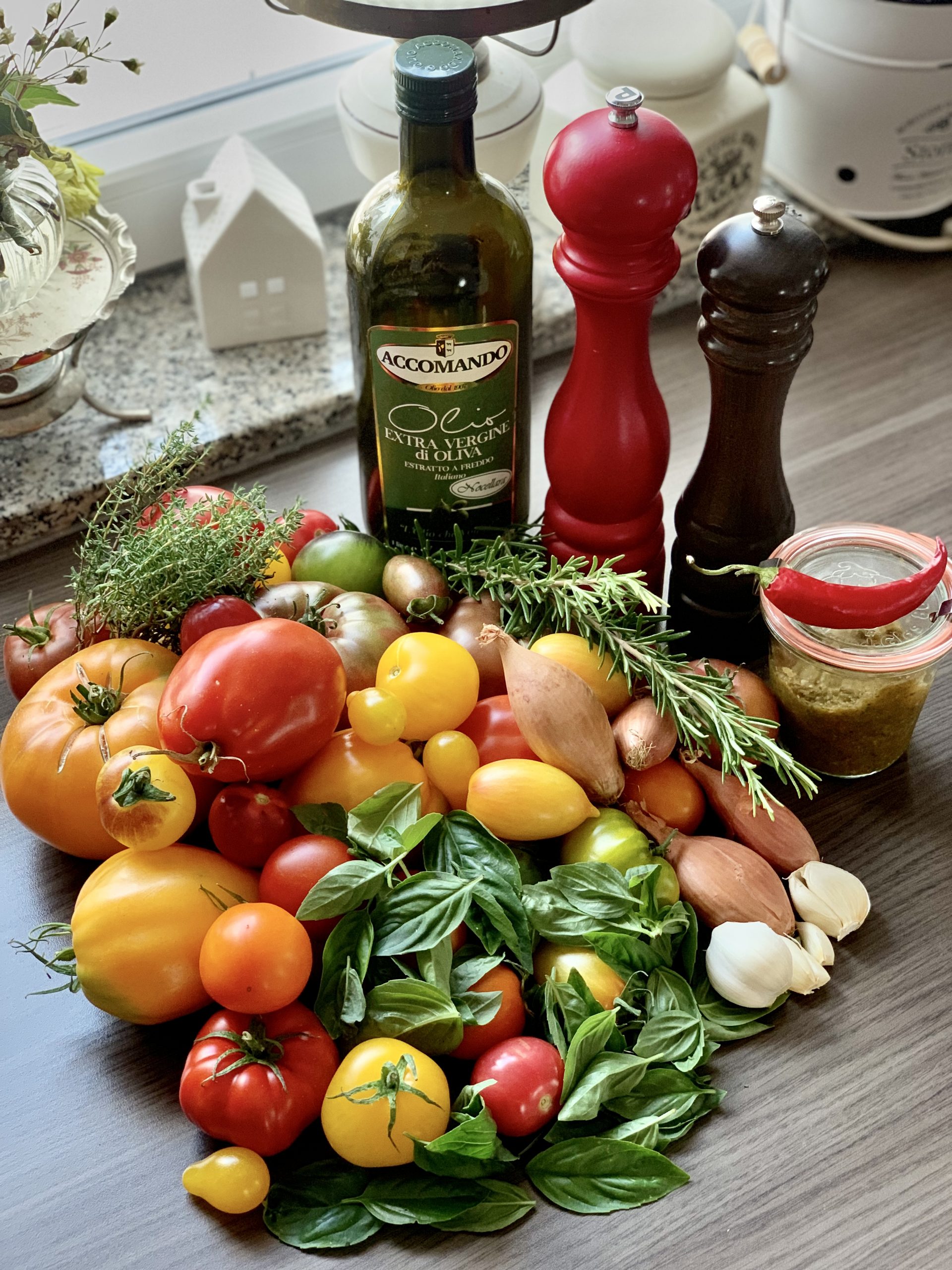 Nach den Tomaten die Zwiebeln, den Knoblauch und die Chili aufs Blech geben und alles erneut mit Olivenöl beträufeln. Schließlich die Kräuter auf das Blech legen, dabei etwas Rosmarin und Basilikum aufheben.