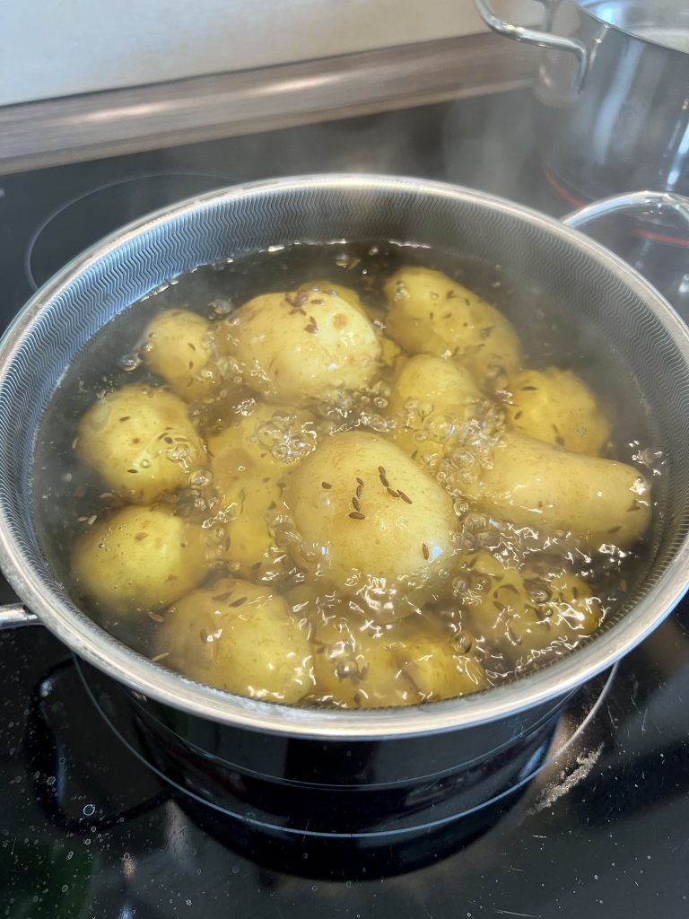 Wenn die Kartoffeln fertig sind, diese heiß schälen und in nicht zu kleine Stücke schneiden. Das warme Dressing zu den heißen Kartoffeln geben und alles gut umrühren. Ich empfehle nicht gleich das gesamte Dressing an den Salat zu schütten, sondern etwas zum Nachwürzen (wenn nötig) aufzuheben. Der Salat soll nicht im Dressing schwimmen.