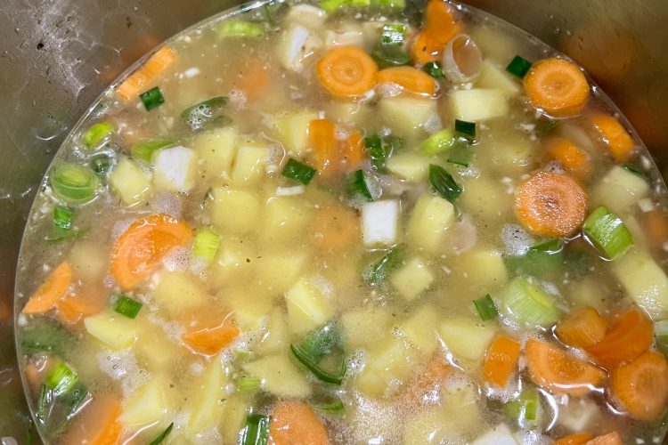 Ein wenig Pflanzenöl in einem großen Topf erhitzen und die Speckstreifen darin bei mittlerer Hitze auslassen. Die Schalottenwürfel hinzufügen und 3 Minuten glasig schwitzen. Knoblauch, Kartoffeln und Gemüse dazugeben und 2 Minuten mitschwitzen. Die Brühe angießen, alles aufkochen und bei mittlerer Hitze etwa 30 Minuten weich kochen.