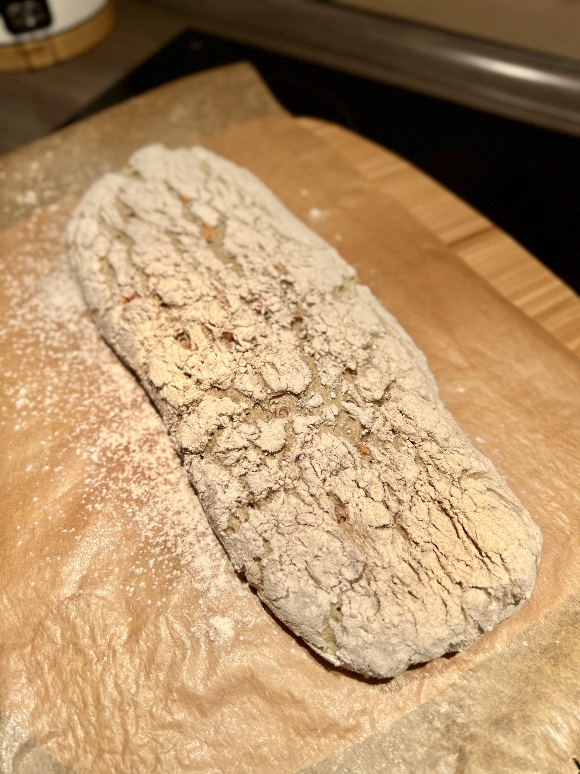 Tipp: Typischerweise wird dieser eher weiche Ciabatta Teig nur sehr locker und schonend in Form gebracht. Es ist wichtig, dass er vor dem Backen genügend lange aufgehen kann. Diese Vorgehensweise führt zu einer charakteristisch unregelmässigen Textur des Ciabattas.