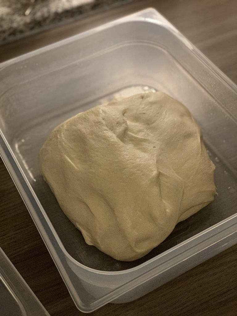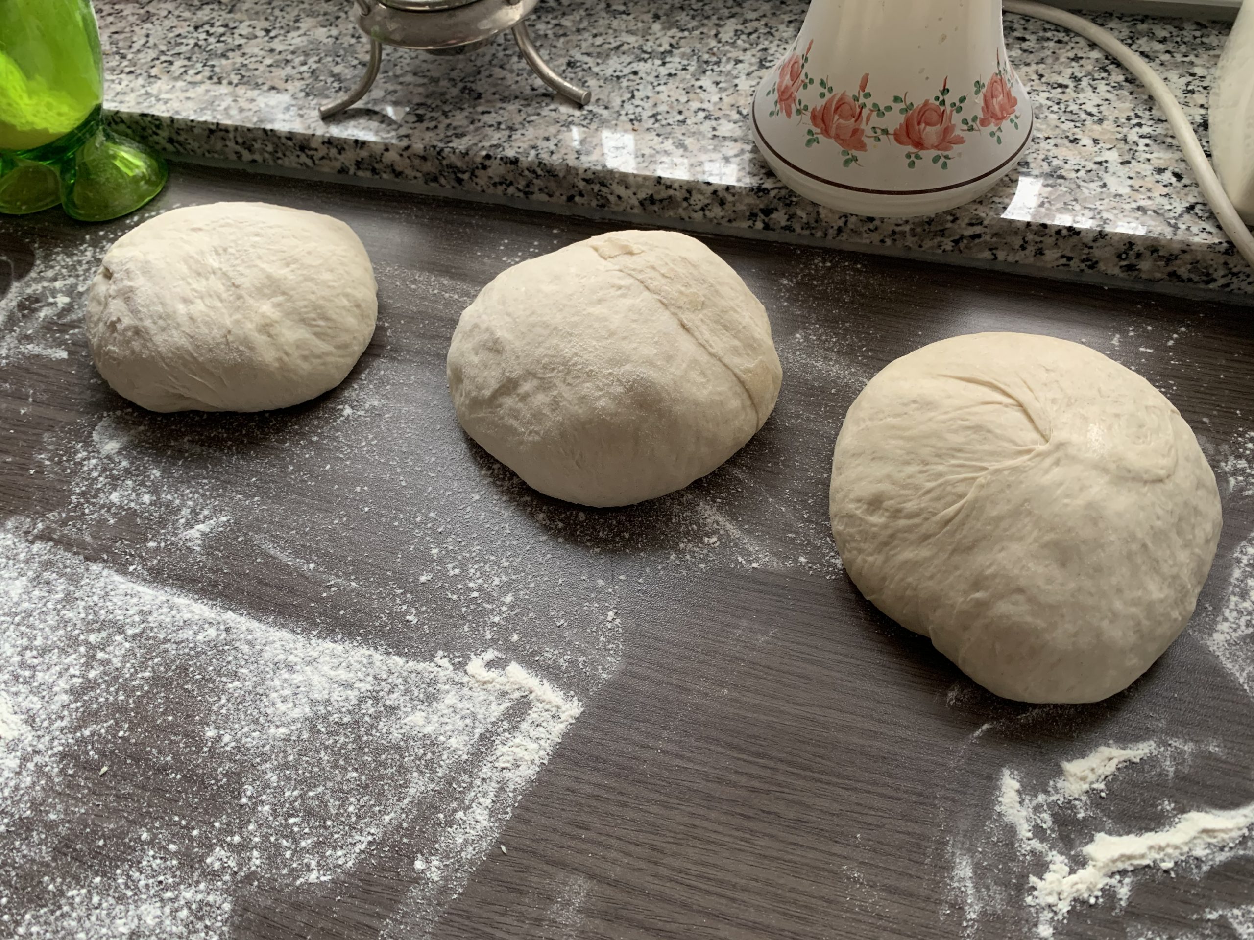 Nach der Gärzeit den Teig auf eine bemehlte Arbeitsfläche geben und in drei oder vier (jeweils etwa 270g) gleich grosse Stücke teilen. Danach die Teiglinge 2-3x über die Arbeitsfläche ziehen um eine glatte Oberfläche zu bekommen. Die Teiglinge schonend zu je einer Kugel formen und dann 5 Min. entspannen lassen.