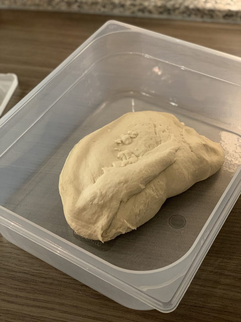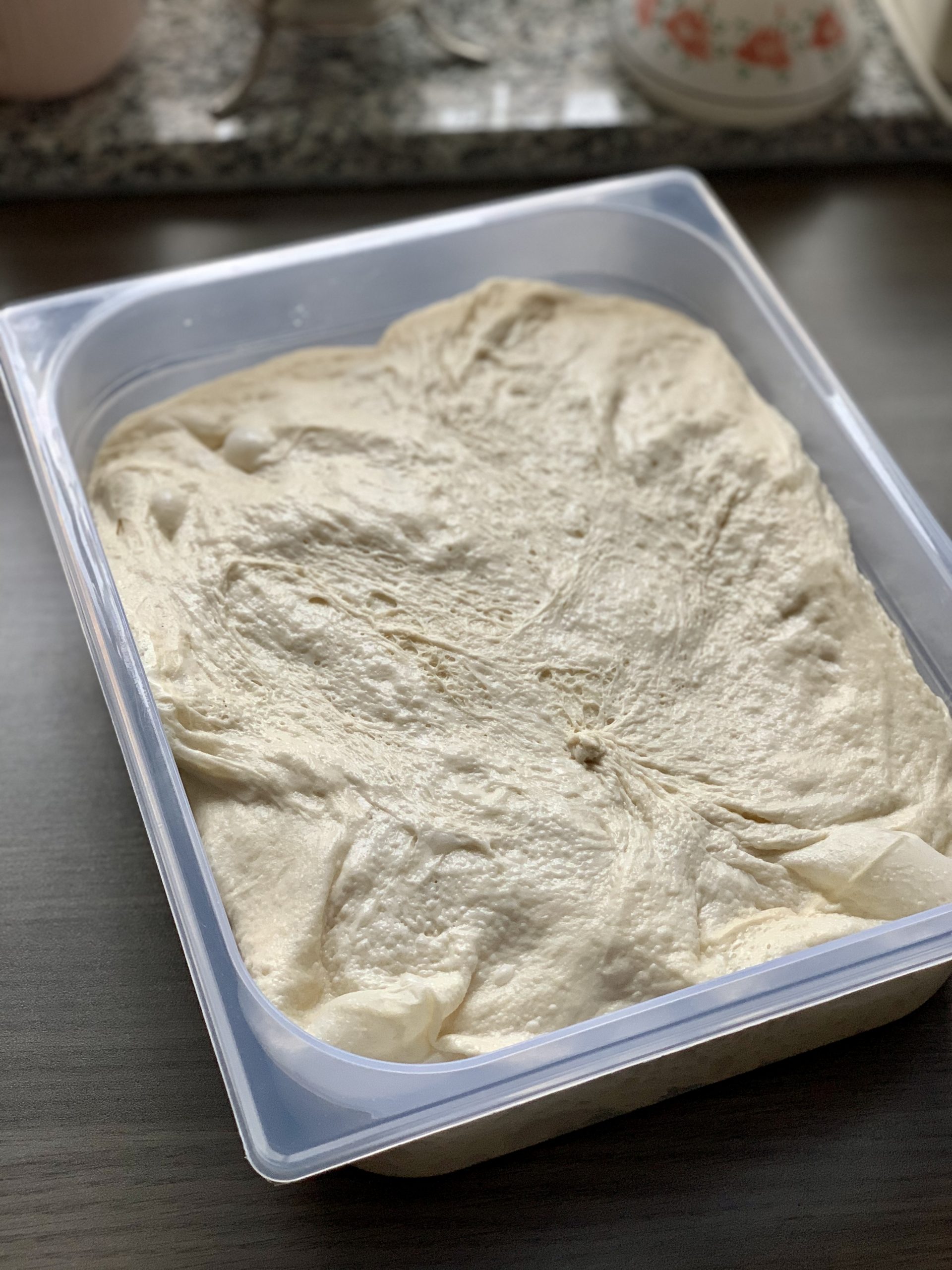 Anschliessend ein grosses – am besten rechteckiges und flaches – Kunststoffbecken gut ausfetten und den Teig hinein legen. Den Teig mit Frischhaltefolie zudecken und für 12 Std. bei 22°C in der Gärbox reifen lassen.