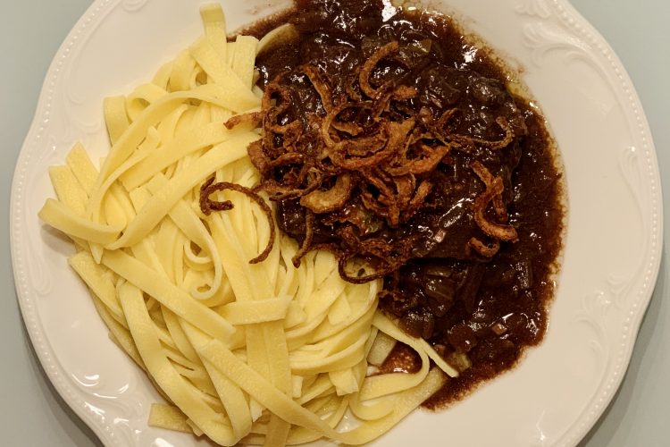 6 Zwiebeln schälen und grob schneiden, Knoblauch fein würfeln. In der Pfanne erneut 1 EL Butter erhitzen und die Zwiebeln mit dem Knoblauch bei mittlerer Hitze glasig dünsten. Mit dem Rotwein ablöschen und köcheln lassen, bis der Rotwein einreduziert ist. Brühe und Fleisch dazugeben und für etwa zwei Stunden auf mittlerer Hitze offen köcheln lassen (je nach Dicke und Beschaffenheit des Fleisches reicht auch nur eine Stunde). Sollte die Sauce zwischendrin vernünftig angedickt sein, die Pfanne abdecken und geschlossen köcheln.