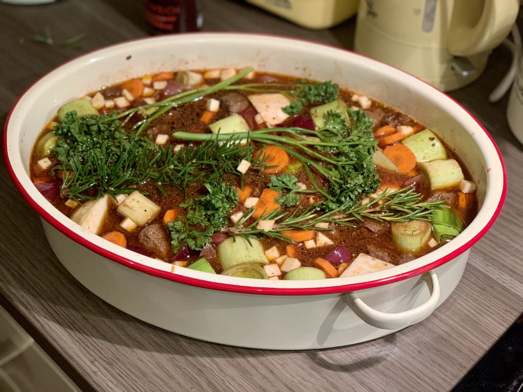 Alle Gewürze in den Bräter geben und am Ende mit dem Rinderfond aufgießen, so dass der gesamte Inhalt gerade so bedeckt ist. Am Ende die Petersilienstiele in den Bräter legen und alles in den Backofen geben.