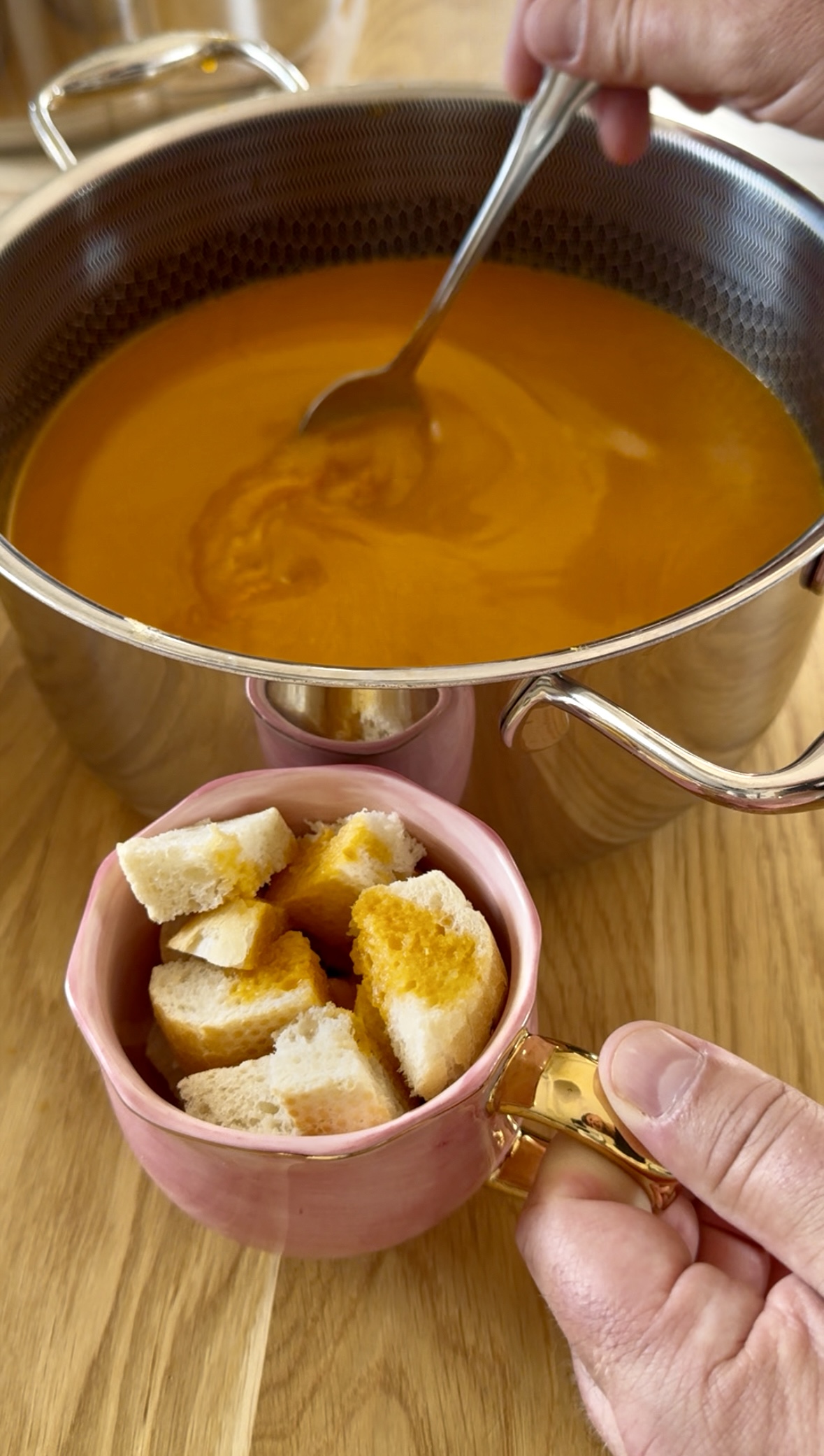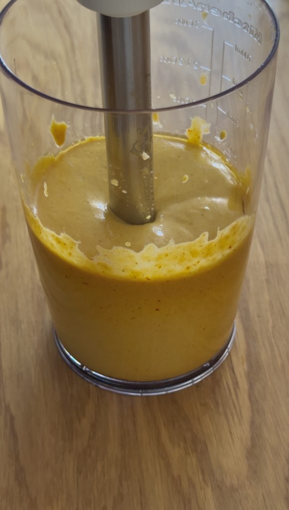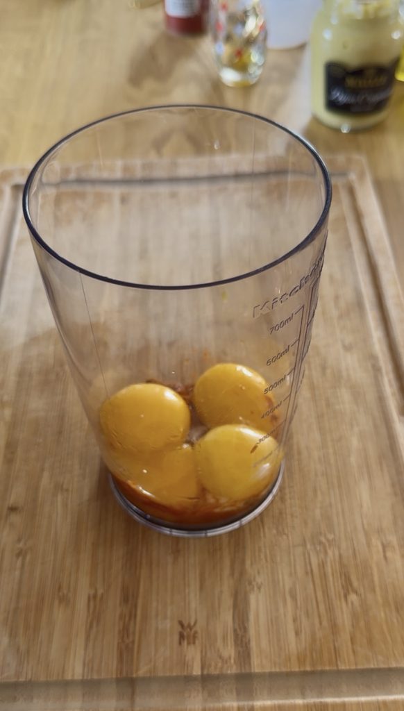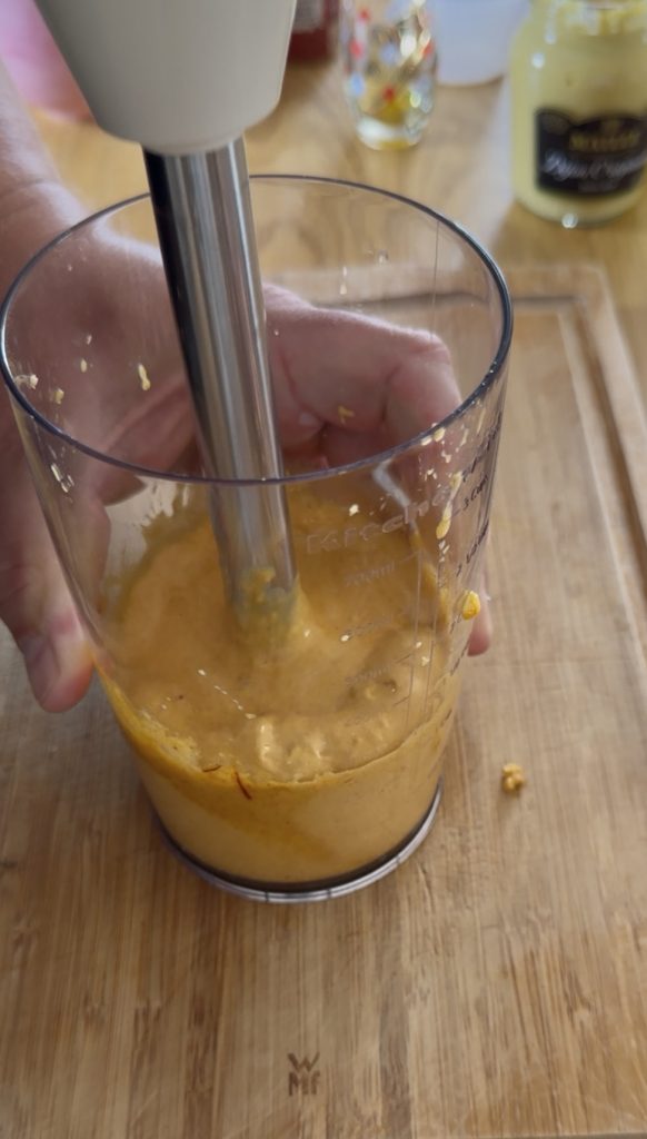 Mit einem Stabmixer Eigelb, Knoblauch, Dijon-Senf, eingeweichtes Brot, Safranmischung (Vorsicht mit dem Zitronensaft), Salz, Paprika und Cayennepfeffer mixen.