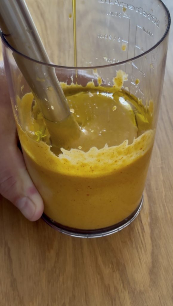 Nach und nach das Olivenöl einträufeln und dabei mixen, bis eine cremige Textur entsteht. Mit etwas Salz Abschmecken und vor dem Servieren mindestens 30 Minuten kühl stellen.