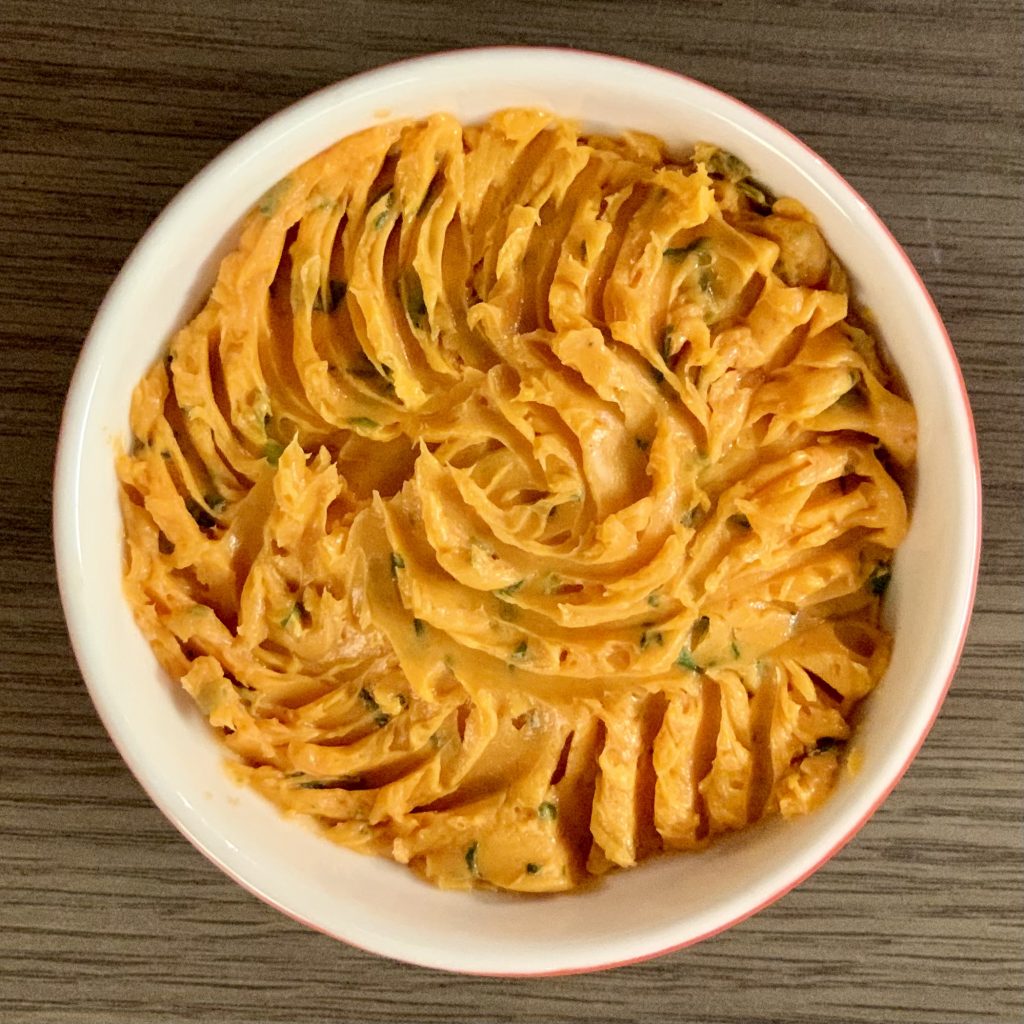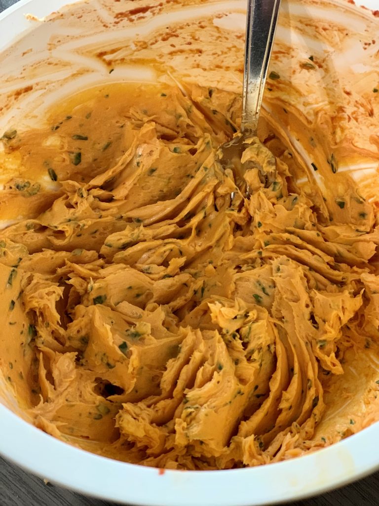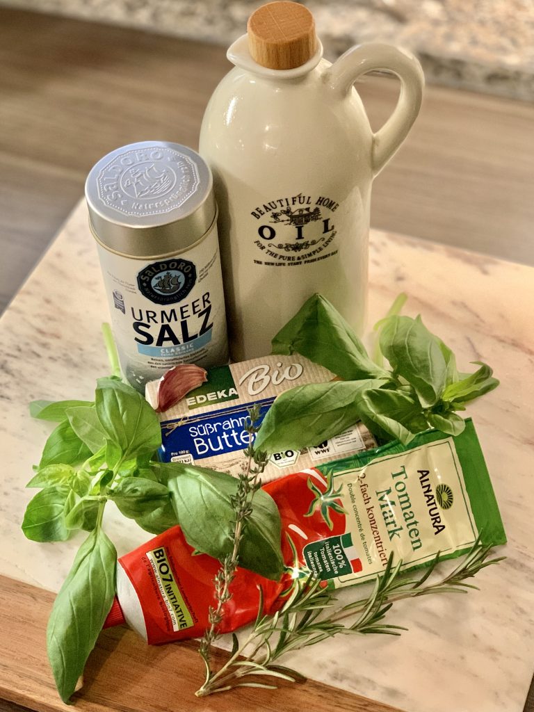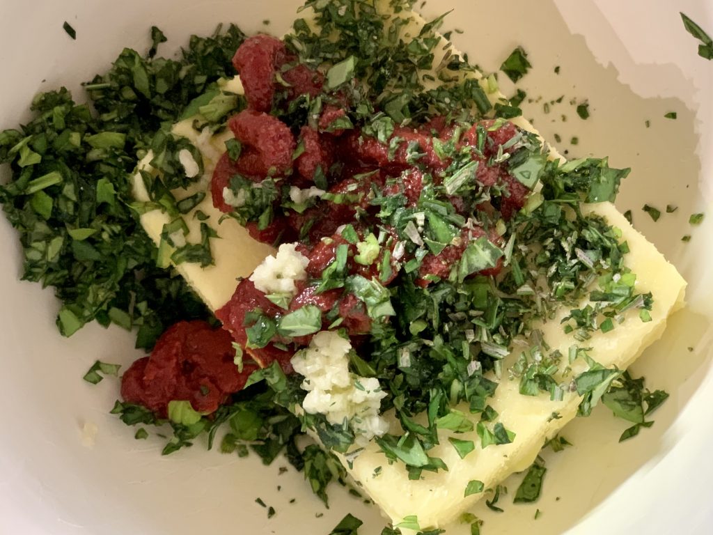 Butter in eine Rührschüssel geben und bei Zimmertemperatur weich werden lassen. Kräuter fein hacken und ebenfalls in die Rührschüssel geben (Vorsicht mit dem Rosmarin, da der sehr intensiv ist, lieber nach und nach hinzufügen). Knoblauch in die Schüssel pressen. Salz, Tomatenmark, Olivenöl nach Geschmack dazu. Mit einer Gabel alles gut vermischen und anschließend im Kühlschrank wieder fest werden lassen.