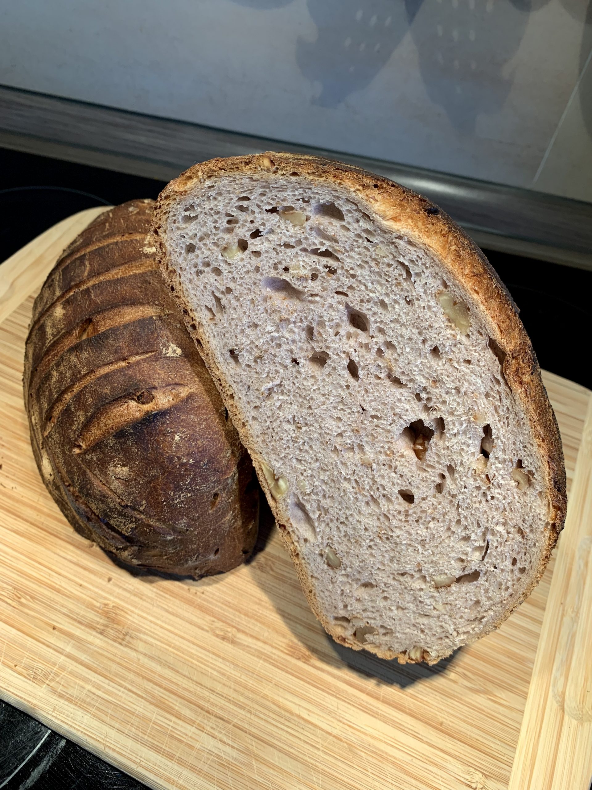 Alle Zutaten außer den Nüssen in die KitchenAid geben (mit dem Wasser beginnen) und für 2-3 Min. auf Stufe 1 ankneten. Danach die Geschwindigkeit auf Stufe 2 erhöhen und den Teig für weitere 8 Min. kneten. Die gehackten Nüsse dazugeben und für weitere 3 Minuten auf Stufe 2-4 kneten.