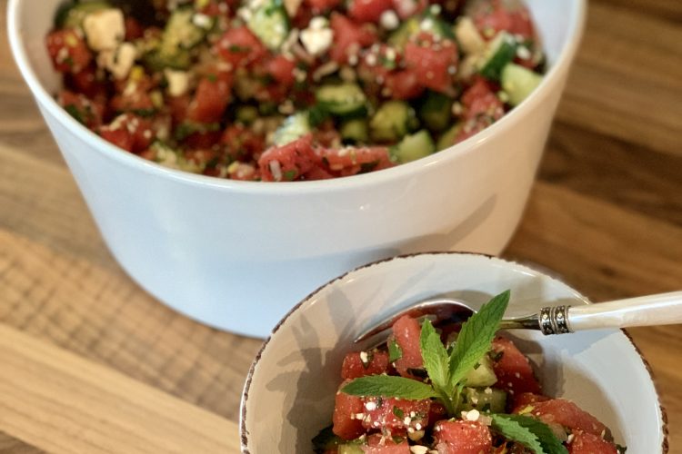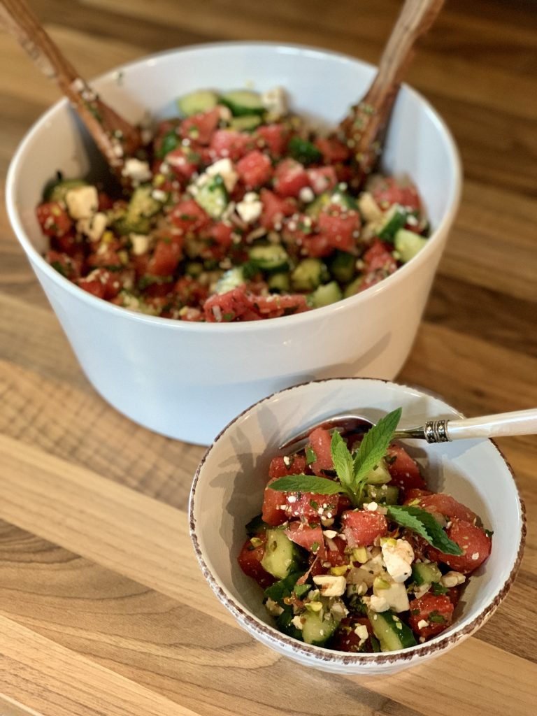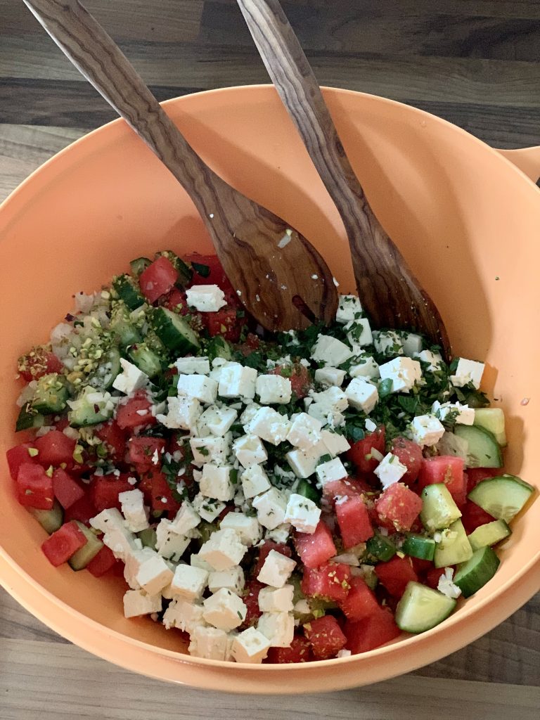 Pistazienkerne aus den Schalen lösen und grob hacken. Gurke waschen, eventuell schälen und in ca. 1 cm große Würfel schneiden. Melone in Spalten schneiden. Das Fruchtfleisch von der Schale schneiden, eventuell entkernen und in etwas größere Würfel schneiden.