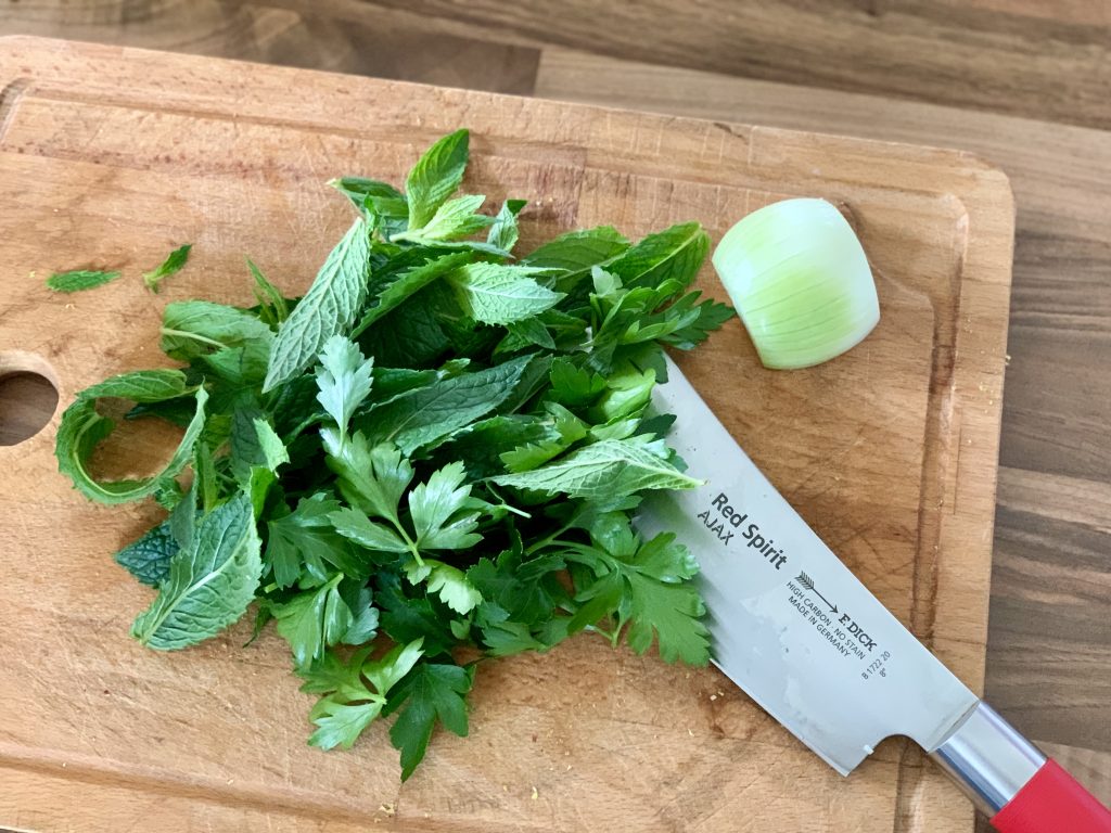 Zwiebel schälen, fein würfeln. Kräuter waschen, trocken schütteln, Blättchen abzupfen und grob hacken. Knoblauch schälen und fein hacken. Als letztes Feta klein würfeln und dazugeben.