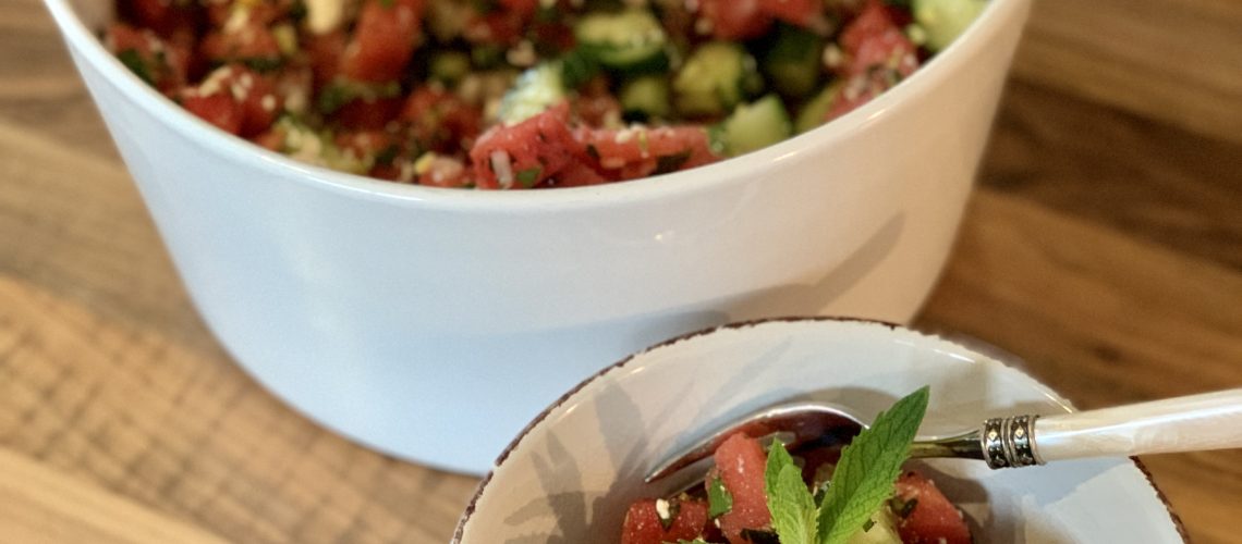 60 g gesalzene geröstete Pistazien (Gewicht ungeschält) 1 Salatgurke 1,5 kg Wassermelone (kernarm) 250 g Feta 1 kleine rote Zwiebel 4 Stiele Minze 4 Stiele Petersilie 1 Knoblauchzehe 6-7 EL heller Balsamico-Essig Salz Pfeffer 2 EL Öl Pistazienkerne aus den Schalen lösen und grob hacken. Gurke waschen, eventuell schälen und in ca. 1 cm große … Wassermelonen-Gurken-Salat mit Feta weiterlesen