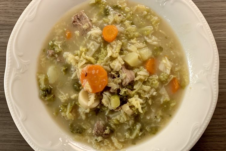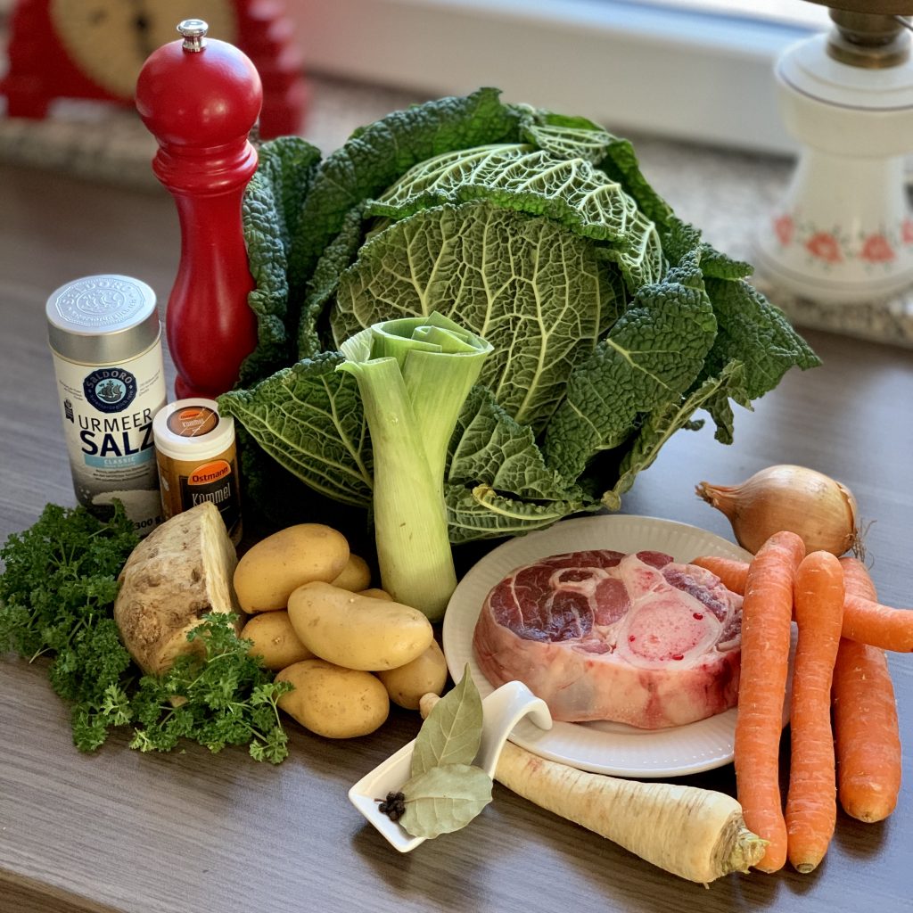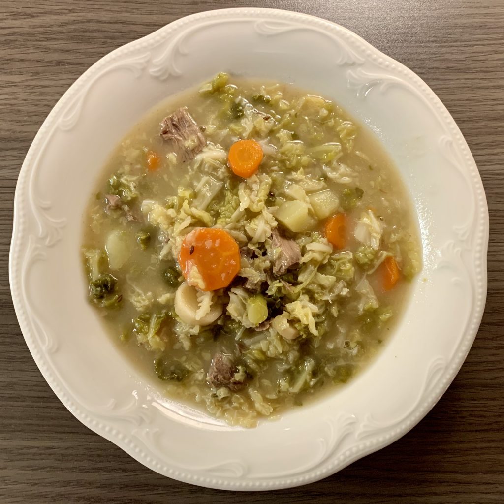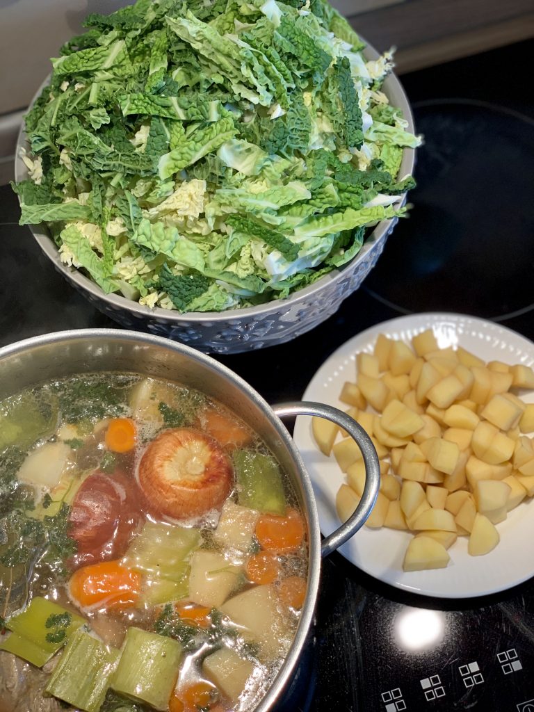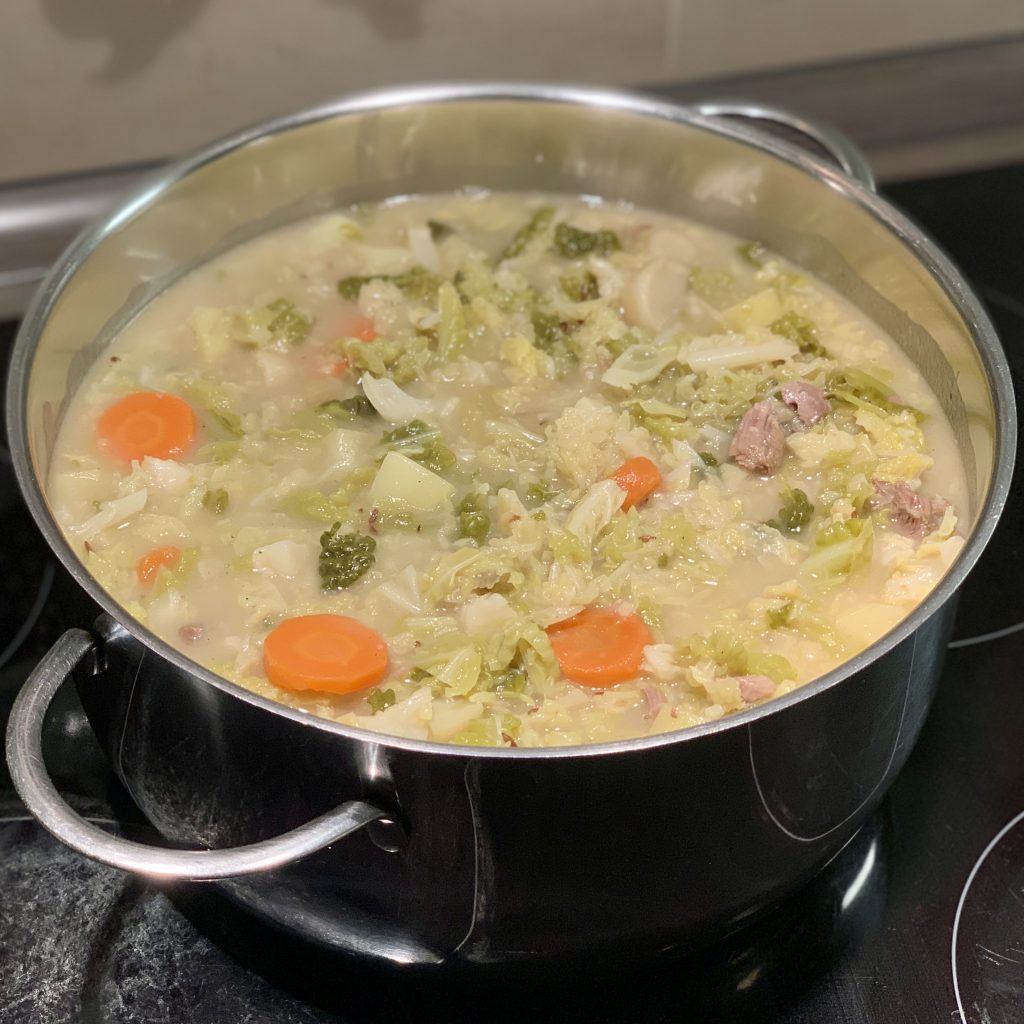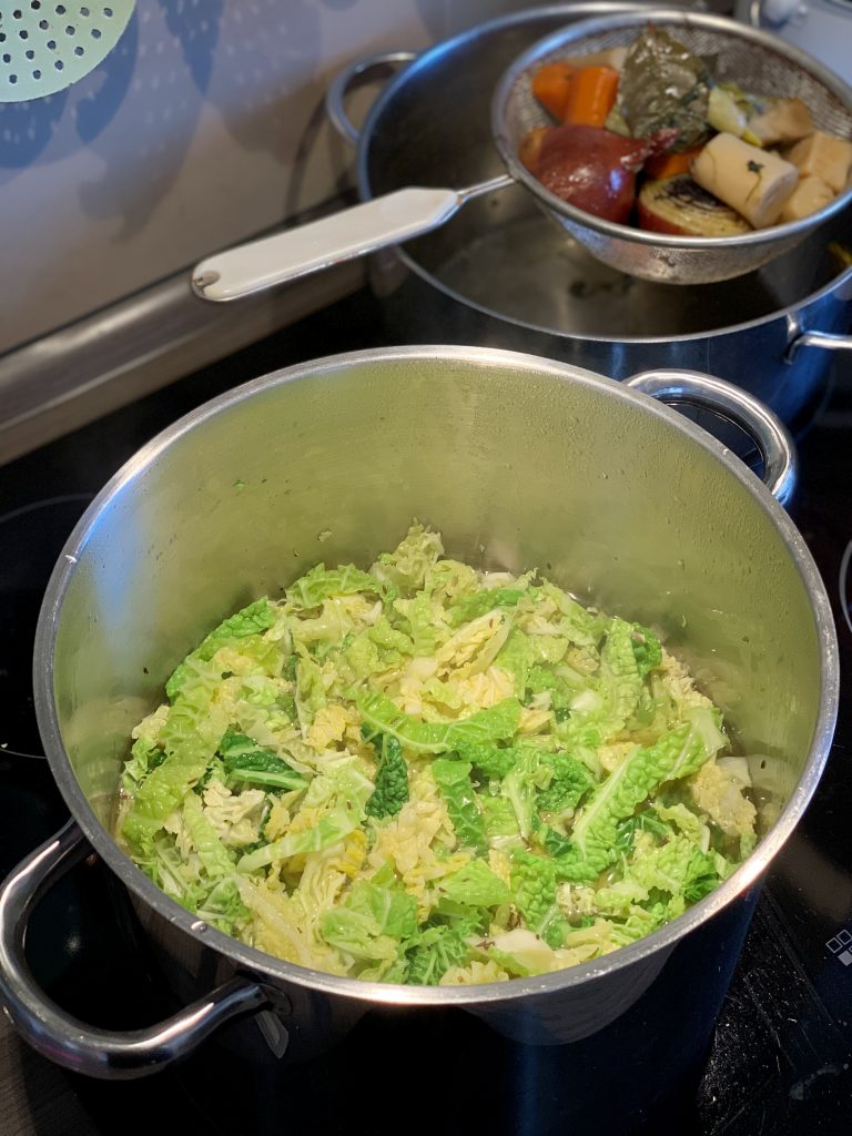 Wirsing in die Brühe geben und mit Wasser auffüllen. Die Flüssigkeit sollte dabei knapp unter den Wirsingblättern stehen (der Wirsing schrumpelt extrem zusammen). Einmal aufkochen und mit reichlich Kümmel, Salz und Pfeffer abschmecken. Köcheln lassen, bis der Wirsing weich ist (25-30 Minuten). Nach 15 Minuten das Fleisch und die Kartoffeln zugeben und mitkochen.