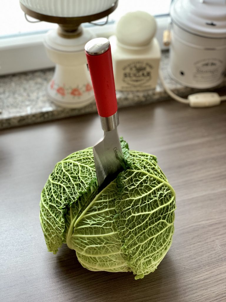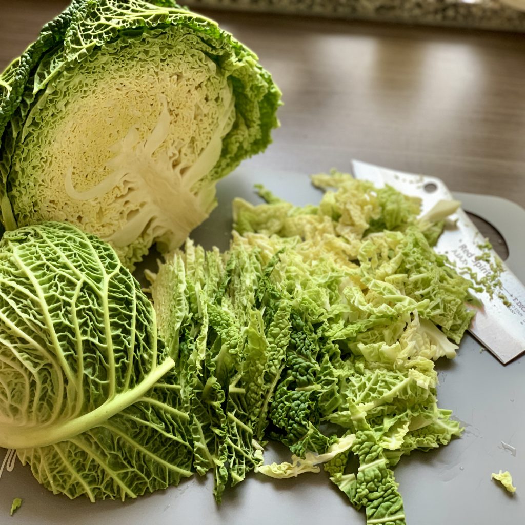 In der Kochzeit Kartoffeln schälen und in etwa 1x1cm große Würfel schneiden. Wirsing von den Außenblättern und dem Strunk befreien und in feine Streifen schneiden.
