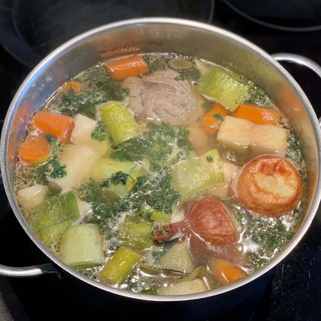 Zwischenzeitlich die Zwiebel ungeschält quer halbieren, auf den Schnittflächen in eine Eisenpfanne setzen und ohne Fett rösten, bis die Schnittflächen fast schwarz sind (alternativ im Suppentopf als allererstes). Restliches Gemüse putzen, ggf. schälen (wenn es sehr dreckig ist), grob zerkleinern. Alle Zutaten mit den Gewürzen zum Fleisch geben.